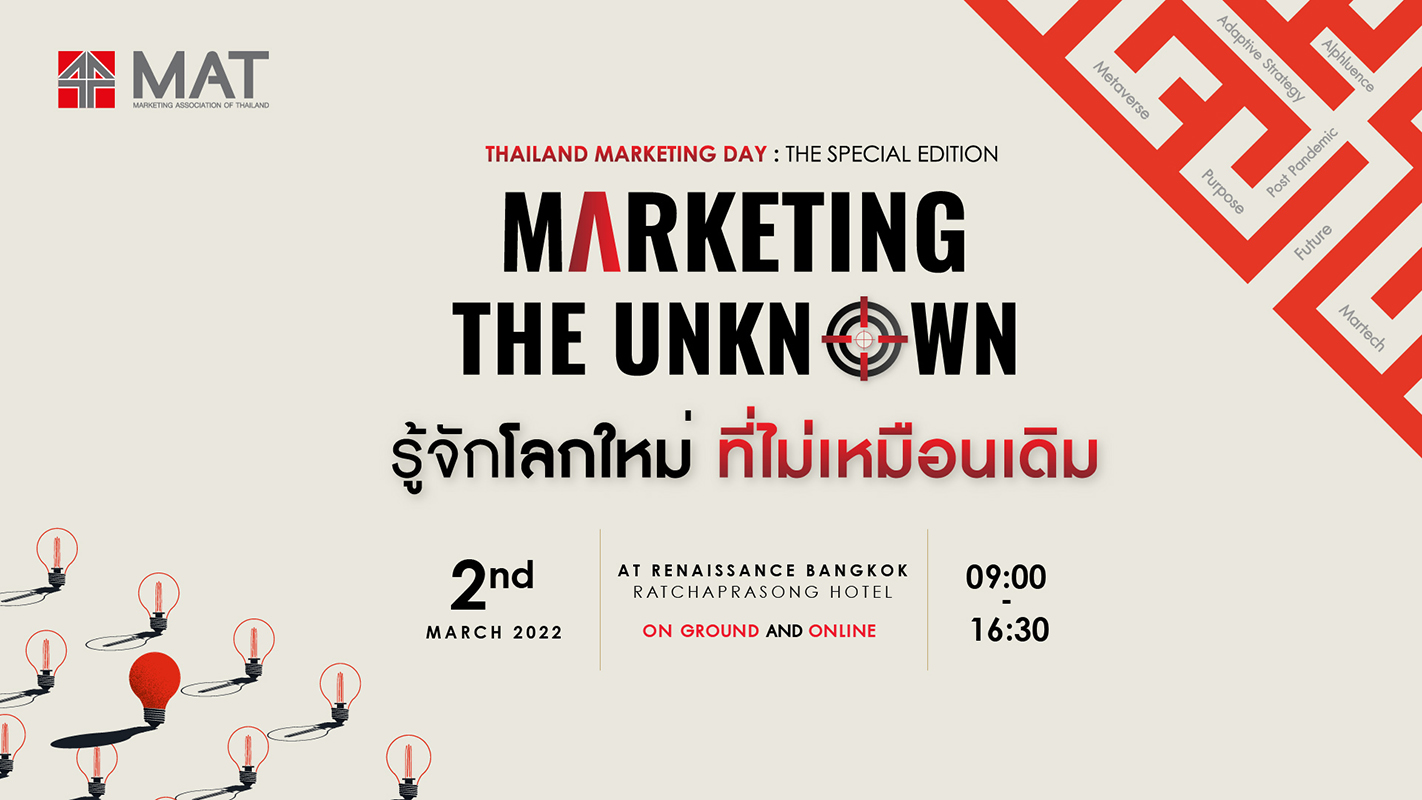 “อย่าเสียเวลากับความไม่ชัดเจน เพราะคำว่า “ไม่รู้” คือ ศัตรูที่แท้จริง” มาเปิดโลกการตลาดยุค Post Pandemic พบทุกมุมมองที่เปลี่ยนไป ให้คุณพร้อมรับความเปลี่ยนแปลง มาข้ามความไม่รู้ ไปสู่โลกใหม่…ที่ไม่เหมือนเดิม กับงาน Thailand Marketing Day: The Special Edition “Marketing the Unknown รู้จักโลกใหม่ ที่ไม่เหมือนเดิม” ของสมาคมการตลาดแห่งประเทศไทย (MAT) งานสัมมนาที่จะได้พบกับวิทยากร และผู้บริหารระดับสูงจากองค์กรชั้นนำผู้มากประสบการณ์ กับหัวข้อที่เจาะลึกพร้อมสร้างแรงบันดาลใจ ปลดล็อคทางความคิดให้กับผู้บริหาร นักการตลาดและผู้ประกอบการ เพื่อให้เห็นถึงความเป็นไปได้ในการเดินหน้าต่อ ติดอาวุธทางความคิดให้มองเห็นเส้นทางการปรับตัวโดยภายในงานจะมีการจัดงานในรูปแบบ Hybrid ทั้ง Offline และ Online โดยครอบคลุมข้อมูลทางธุรกิจและการตลาดที่น่าสนใจพร้อม Session สุดพิเศษ กับ Special Track วีดิโอคลิป วิสัยทัศน์ และมุมมอง ของผู้นําทางความคิดในโลกธุรกิจที่ทรงอิทธิพลที่สุดของประเทศไทย พร้อมกับร่วมลุ้นไปกับการประกาศผลรางวัล Marketing Awards of Thailand 2021 และมอบรางวัลสุดยอดแคมเปญการตลาดแห่งปี 2564 และร่วมฟังเคสจากผู้ชนะของแต่ละกลุ่มรางวัลอีกด้วยโดยงานจะจัดขึ้นใน วันพุธที่ 2 มีนาคม 2565 เวลา 09.00 - 16.30 น. ณ โรงแรมเรเนซองส์ กรุงเทพฯ ราชประสงค์ สามารถสอบถามรายละเอียดได้ที่ สมาคมการตลาดฯ 02-679 7360-3 หรือ Line: @matsociety