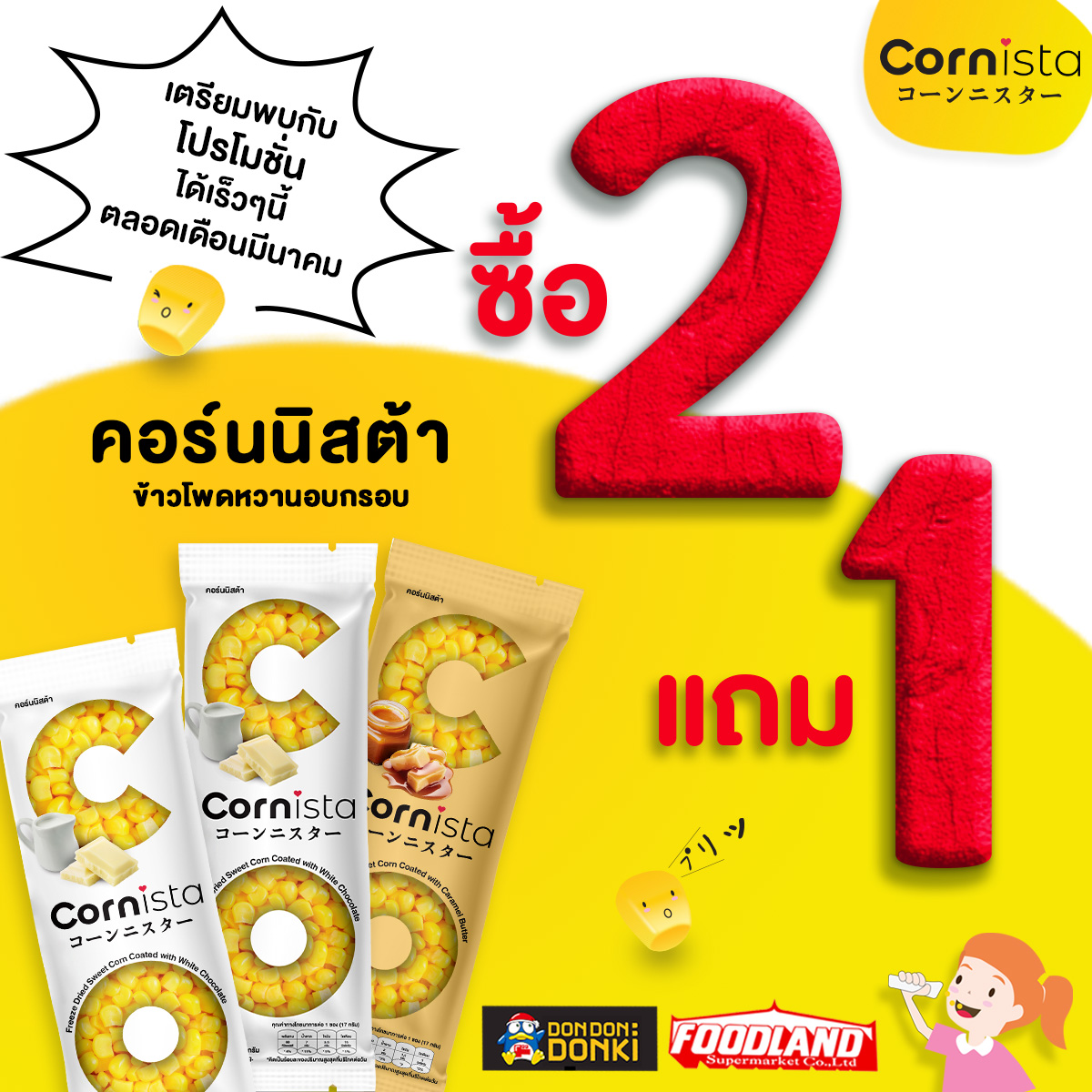 มาพร้อมโปรโมชั่นสุดคุ้ม ตลอดเดือนมีนาคมนี้ จากราคาปกติซองละ 20 บาท โปรโมชั่น ซื้อ 2 แถม 1 ทั้ง 2 รสชาติ รสไวท์ช็อกโกแลต และคาราเมลบัตเตอร์ แค่ฉีกซองอร่อยได้ทันที ทุกที่ ทุกเวลา รีบพุ่งตัวไปจัด Cornista ทั้ง 2 รสชาติ มาลองกันได้แล้วที่ Donki ตั้งแต่วันที่ 1-31 มีนาคม 2568 และ Foodland ตั้งแต่วันที่ 7-19 มีนาคม 2568 ทุกสาขา