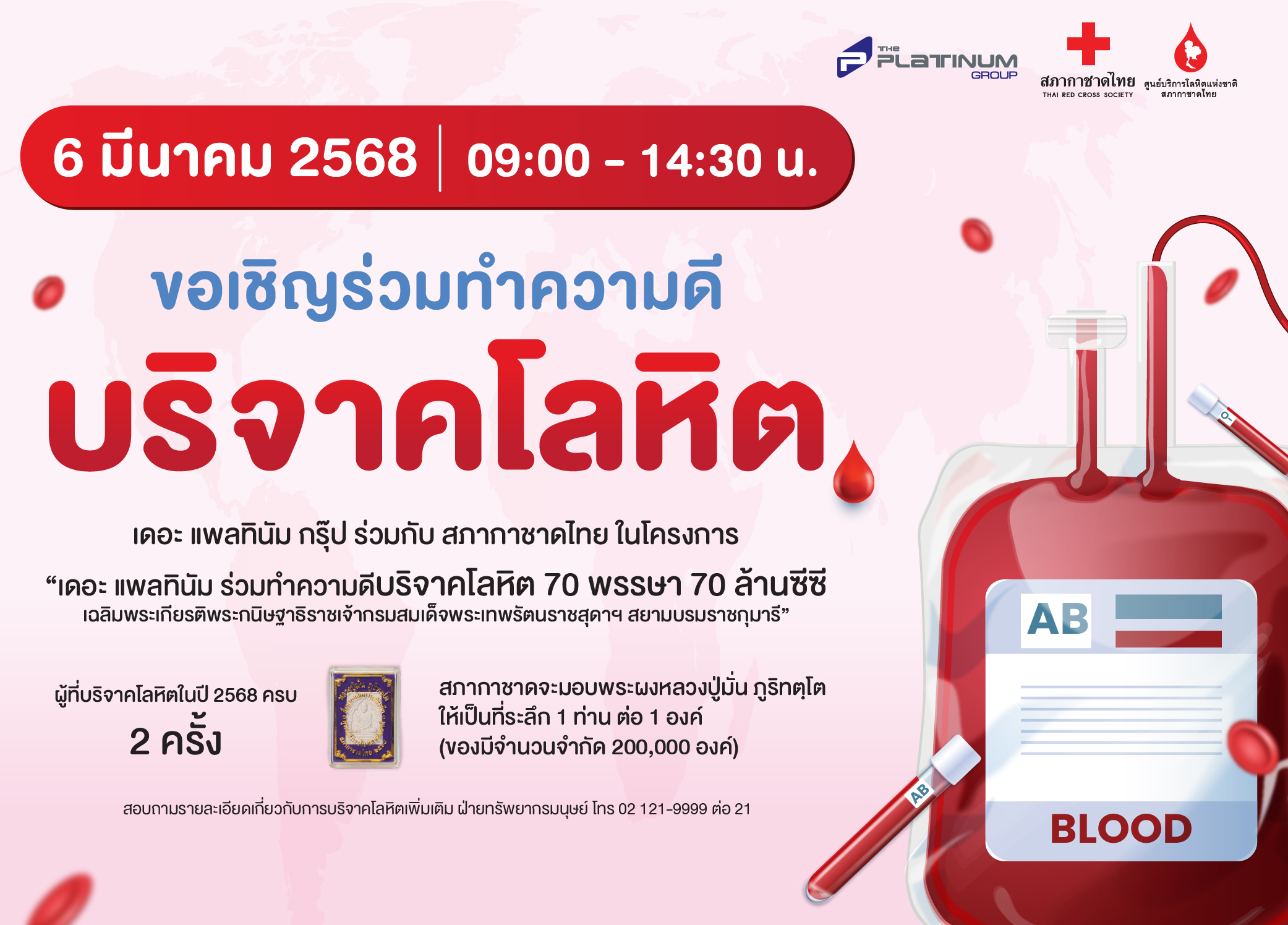 บริษัท เดอะ แพลทินัม กรุ๊ป จำกัด (มหาชน) ร่วมกับ สภากาชาดไทย ขอเชิญทุกท่านร่วมทำความดี บริจาคโลหิตช่วยเหลือผู้ป่วย ในโครงการ “เดอะ แพลทินัม ร่วมทำความดี บริจาคโลหิต 70 พรรษา 70 ล้านซีซี” ให้กับสภากาชาดไทย เฉลิมพระเกียรติพระกนิษฐาธิราชเจ้า กรมสมเด็จพระเทพรัตนราชสุดาฯ สยามบรมราชกุมารี เนื่องในโอกาสวันคล้ายวันพระราชสมภพ ทรงเจริญพระชนมายุ 70 พรรษา 2 เมษายน 2568 โดยโลหิตที่ได้รับบริจาคจะนำไปช่วยเหลือผู้ป่วยทั่วประเทศที่รอคอยโลหิตในการผ่าตัดและรักษาโรคภัยไข้เจ็บซึ่งเกิดจากกรณีต่างๆ