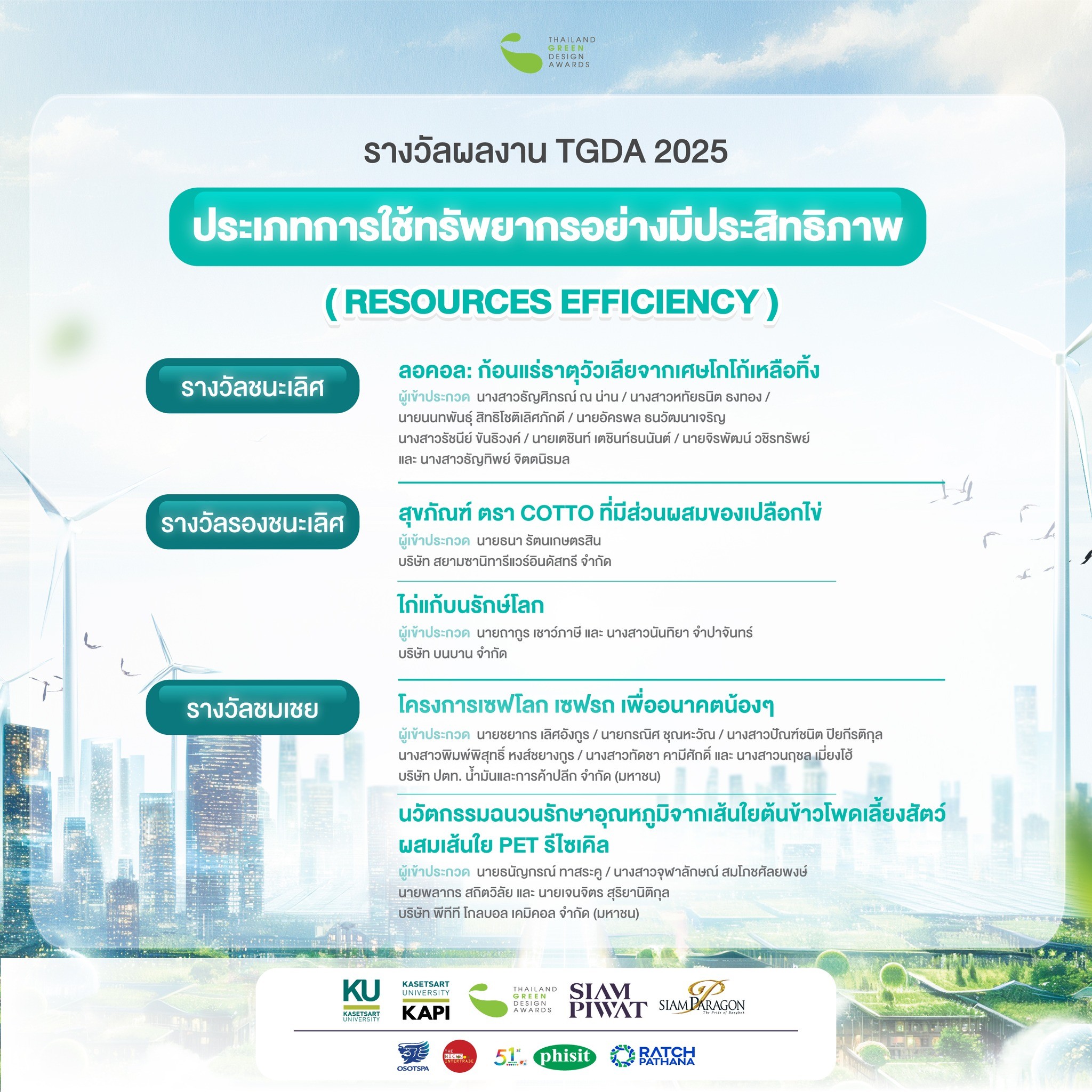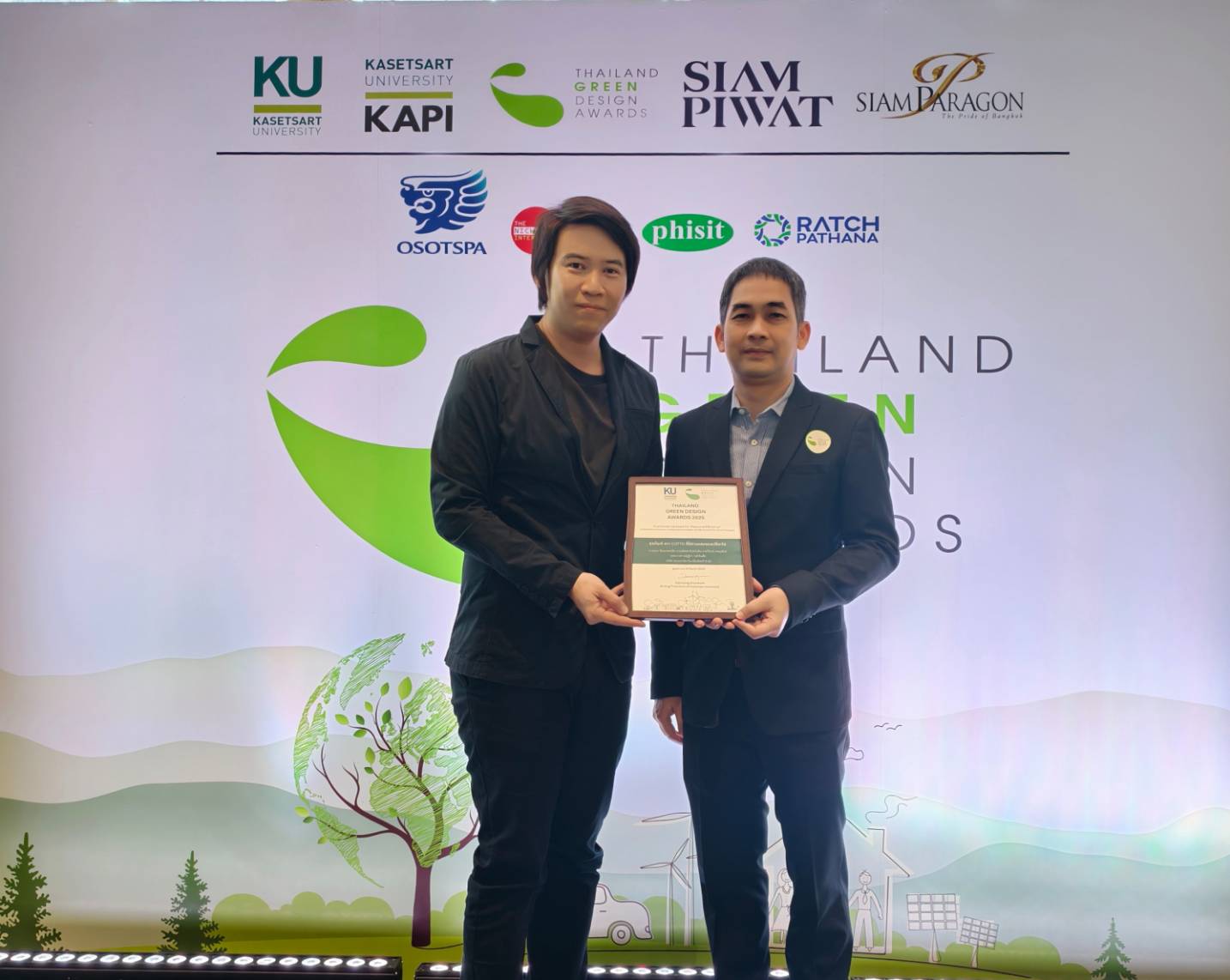 สุขภัณฑ์ COTTO ได้รับรางวัลรองชนะเลิศอันดับ 1 นำทีมโดย นายธนา รัตนเกษตรสิน นายณัชพล อินทร์กลิ่น นายวิโรจน์ งามภูพันธ์ และนางสาวณัฏฐิกา วงค์จันเสือ บริษัท สยามซานิทารีแวร์อินดัสทรี จำกัด ซึ่งเป็นผลงานประกวดประเภทที่ 2 ผลงานประเภทการใช้ทรัพยากรอย่างมีประสิทธิภาพ (Resource Efficiency) ผลงานที่มีการออกแบบที่มุ่งเน้นการใช้ทรัพยากรอย่างมีประสิทธิภาพและเปลี่ยนจากขยะให้กลายเป็นทรัพยากรทรงพลัง การนำกลับมาใช้ใหม่ (Recycle) รวมถึงผลงานออกแบบที่ช่วยในการลดปริมาณขยะ (Reduce Waste) การคิดค้นและพัฒนาผลิตภัณฑ์เพื่อลดขยะ อันจะเป็นการสร้างหนทางที่จะนำวัสดุเหลือใช้และกลับมาใช้อีกครั้ง เป็นนวัตกรรมการเพิ่มมูลค่าและการใช้ประโยชน์จากเศษเหลือทิ้ง (Upcycling) เพื่อนำมาใช้ประโยชน์ในการคำนวณคาร์บอนฟุตปริ้นท์ (Carbon footprint) พิธีมอบรางวัล Thailand Green Design Awards 2025 สถาบันค้นคว้าและพัฒนาผลิตผลทางการเกษตรและอุตสาหกรรมเกษตร มหาวิทยาลัยเกษตรศาสตร์ จัดประกวดผลิตภัณฑ์ที่เป็นมิตรต่อสิ่งแวดล้อม Thailand Green Design Awards 2025 ในงานเกษตรแฟร์ ประจำปี 2568 โดยมุ่งเน้นความคิดสร้างสรรค์ในการผลิตผลิตภัณฑ์อย่างเป็นระบบ เน้นนวัตกรรมที่เป็นมิตรต่อสิ่งแวดล้อม ให้ความสำคัญกับปัญหาขยะที่ทวีความรุนแรงเพิ่มมากขึ้น รวมไปถึงการออกแบบและพัฒนาผลงานที่ยกระดับคุณภาพการใช้ชีวิตภายใต้สภาวการณ์ปัจจุบัน การส่งเสริมการใช้ประโยชน์ทรัพยากรชีวภาพ และการสร้างสังคมที่ยั่งยืนด้วยการมีส่วนร่วมในทุกภาคส่วน และปลูกจิตสำนึกด้านสิ่งแวดล้อมและร่วมสร้างสรรค์ผลิตภัณฑ์จากวัสดุธรรมชาติ และมีกระบวนการผลิตที่เป็นมิตรต่อสิ่งแวดล้อม ทั้งในเรื่องการเผยแพร่เอกลักษณ์ด้านสิ่งแวดล้อมและเป็นมหาวิทยาลัยสีเขียว (KU Green Campus) ซึ่งแบ่งออกเป็นการมอบรางวัลผลงานประเภทประหยัดพลังงาน (Energy Saving) รางวัลผลงานประเภทการใช้ทรัพยากรอย่างมีประสิทธิภาพ (Resource Efficiency) รางวัลผลงานประเภทที่ช่วยยกระดับคุณภาพการใช้ชีวิต (Life Enhancement) รางวัล TGDA Student Design Awards 2025 รางวัล ODS (Object of Desire Store) และรางวัลเกียรติยศ Honorary Awards