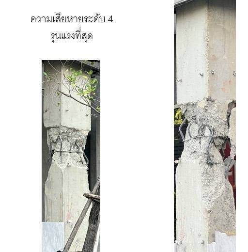 ระดับที่ 4 – คอนกรีตกะเทาะถึงแกนเสาด้านใน เห็นเหล็กเสริมด้านใน บิด งอ ไม่ตรง เหล็กปลอกง้างออกหรือขาด เป็นความเสียหายที่รุนแรงที่สุด ไม่ควรเข้าใช้อาคาร แต่ควรซ่อมแซมและเสริมความแข็งแรงเสาเสียก่อน[/size]