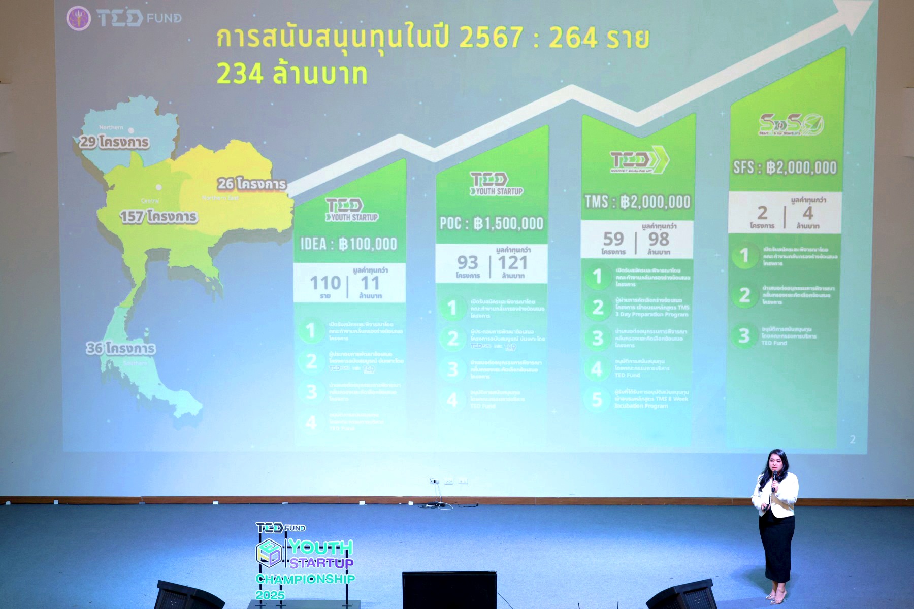 “จากการดำเนินกิจกรรมการสนับสนุนทุนแก่ผู้ประกอบการ ตั้งแต่ปี พ.ศ. 2561 – 2567 ตลอดระยะเวลา 6 ปี TED Fund ได้สนับสนุนเงินทุนอุดหนุนแบบให้เปล่า (Grant) ไปแล้ว จำนวน 1,160 โครงการ คิดเป็นเงินมูลค่ากว่า 1,100 ล้านบาท ซึ่งสร้างผลกระทบทางเศรษฐกิจและสังคมให้กับประเทศแล้วกว่า 4,000 ล้านบาท ซึ่งในปี 2568 นี้ TED Fund วางแผนดำเนินโครงการจัดสรรเงินสนับสนุนผู้ประกอบการเทคโนโลยีและนวัตกรรม ภายใต้กลุ่มโครงการยุววิสาหกิจเริ่มต้น (TED Youth Startup) ในรูปแบบ “การสนับสนุนทุนอุดหนุนสมทบบางส่วน (Matching Grant)” ให้แก่ผู้ประกอบการทั้งที่เป็นบุคคลธรรมดาและที่เป็นนิติบุคคล ผ่านเครือข่ายร่วมพัฒนาผู้ประกอบการ (TED Fellow) มีเป้าหมายเพื่อส่งเสริมและพัฒนาเยาวชนไปสู่การเป็นผู้ประกอบการวิสาหกิจเริ่มต้น (Startups) และมุ่งเน้นสู่การเป็นมหาวิทยาลัยแห่งผู้ประกอบการ โดยมีเป้าหมายที่จะสนับสนุนเงินทุนในกลุ่มนี้กว่า 158 ล้านบาท หรือประมาณ 200 ราย และนอกเหนือจากการให้ทุนสนับสนุนแล้ว TED Fund ยังให้ความสำคัญกับการพัฒนาศักยภาพของผู้ประกอบการเช่นกัน เพื่อช่วยสร้าง สนับสนุนผู้ประกอบการให้เติบโตได้อย่างมั่นคงและยั่งยืน”