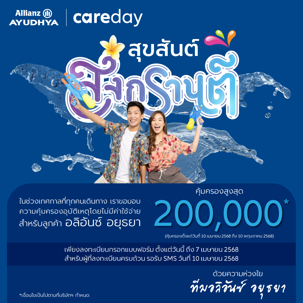 อลิอันซ์ อยุธยา ส่งความห่วงใยถึงลูกค้าคนสำคัญ เที่ยวเทศกาลสงกรานต์อย่างอุ่นใจ มอบความคุ้มครองอุบัติเหตุโดยไม่มีค่าใช้จ่ายสำหรับลูกค้ารายเดี่ยว ในช่วงเทศกาลสงกรานต์ ให้ความคุ้มครองสูงสุดถึง 200,000 บาท ตั้งแต่วันที่ 10 เมษายน 2568 ถึง 10 พฤษภาคม 2568 ผู้ที่สนใจสามารถลงทะเบียนรับสิทธิ์ได้ตั้งแต่ วันนี้ - 7 เมษายน 2568 ผ่านทางเว็บไซต์ allianzth.co/careday25 โดยสิทธิ์มีจำนวนจำกัด 50,000 สิทธิ์ ตลอดโครงการ และผู้ที่ลงทะเบียนครบถ้วนจะได้รับ SMS ยืนยันภายในวันที่ 10 เมษายน 2568 ทั้งนี้ สิทธิพิเศษดังกล่าว จำกัด 1 สิทธิ์ต่อ 1 ท่าน และเฉพาะลูกค้ารายเดี่ยวของอลิอันซ์ อยุธยา เท่านั้น ลูกค้าประกันกลุ่มไม่สามารถรับสิทธิ์นี้ได้ ผู้สนใจสามารถศึกษารายละเอียดเพิ่มเติมได้ที่ https://campaign.azay.co.th/.../term-and-condition...