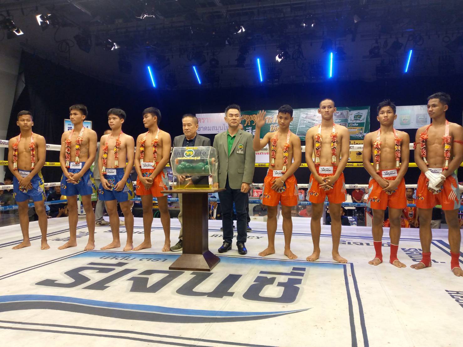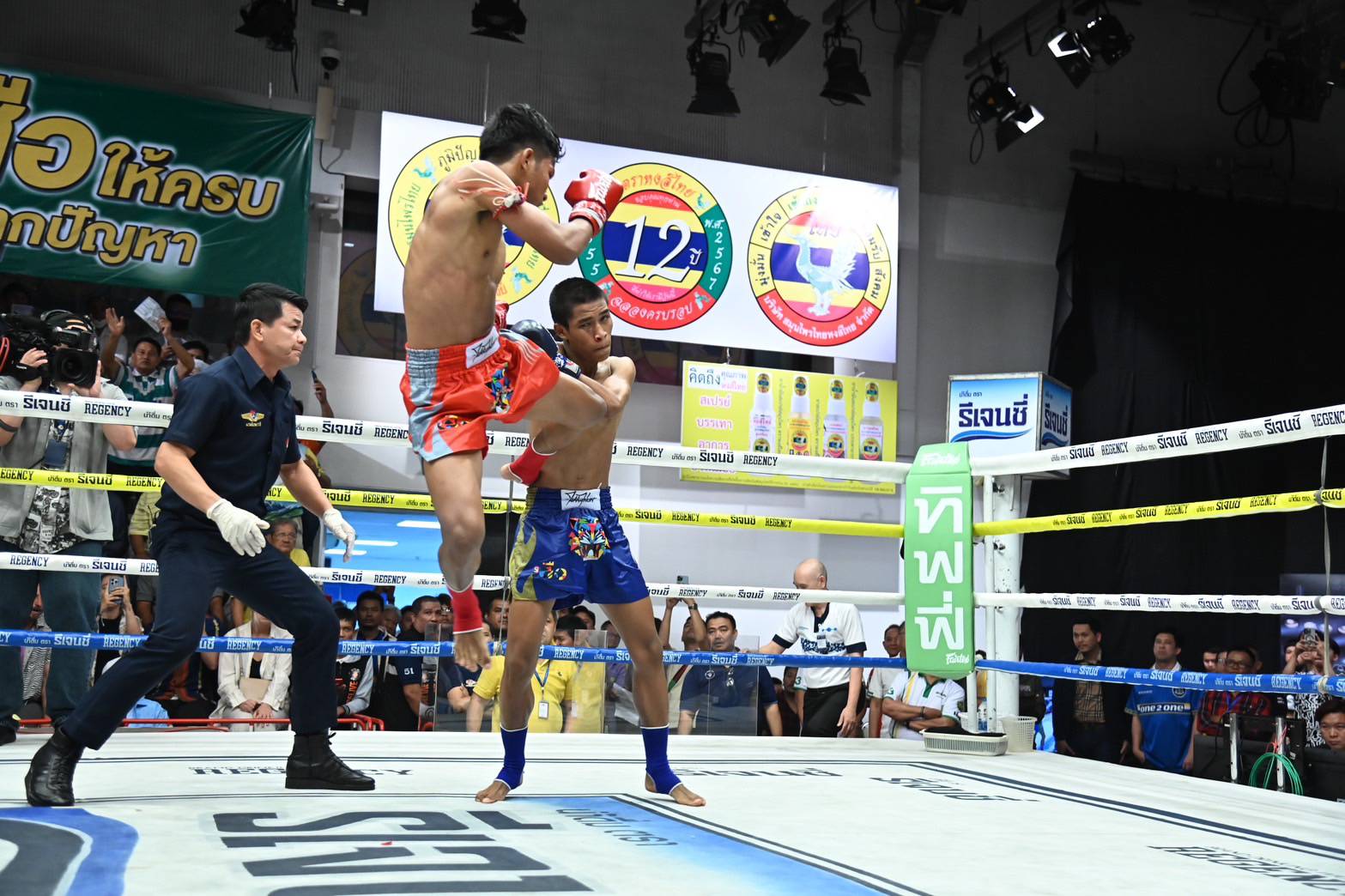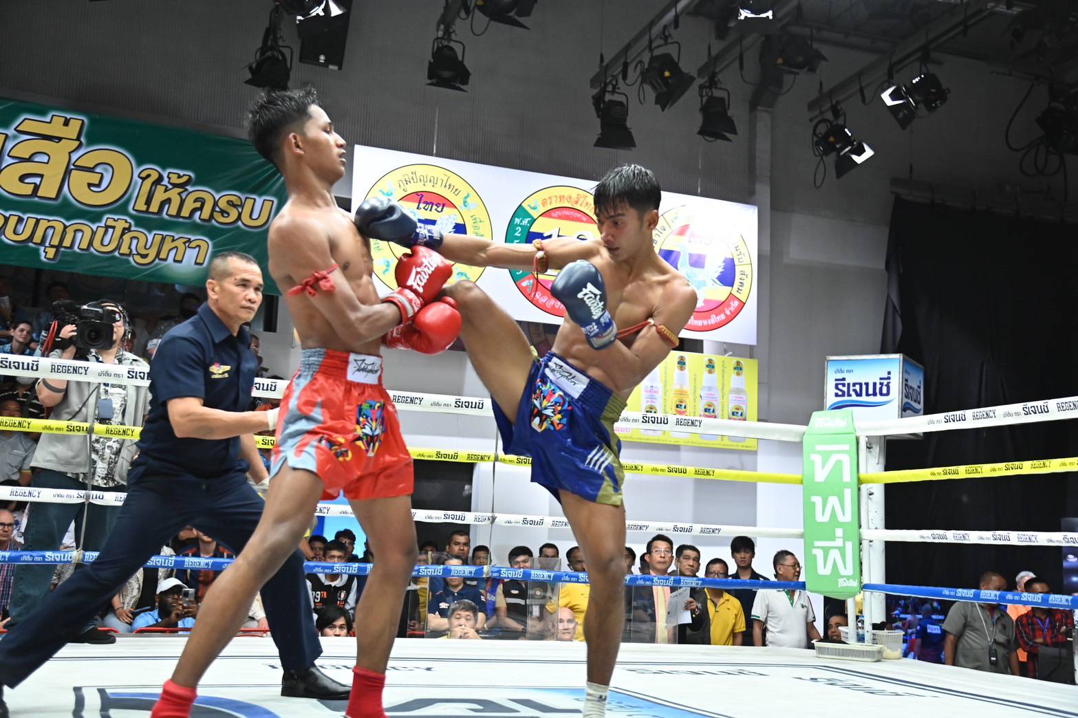 คู่ที่ 1. น็อคยก 2 ก้องสนั่น ส.เทียนโพธิ์ (แดง) พบกับ จ่ากล้า ศูนย์กีฬาห้วยต้ม (น้ำเงิน) ใครแพ้ตกรอบ ก้องสนั่น อาศัยตัวเล็กกว่าเดินเข้าหาเตะขวาลำตัว ด้าน จ่ากล้า สูงยาวเข่าแหลมต้นยก 2 ก้องสนั่น เดินจับในเหนียวแน่นปล้ำตีเข่าข้างเดียวทำเอา จ่ากล้า ดิ้นไม่หลุดทิ้งตัวลงไปนอนให้กรรมการนับ 8 ชกต่อได้ ก้องสนั่น ได้โอกาสเดินจับตีเข่าเป็นชุดฝ่ายเดียว จ่ากล้า ทนไม่ไหวทิ้งตัวนอนให้กรรมการนับ 10 ทันทีทำให้ ก้องสนั่น ส.เทียนโพธิ์ เป็นฝ่ายชนะ TKO ยก 2 ผ่านเข้ารอบ 8 คน ส่วน จ่ากล้า ตกรอบ