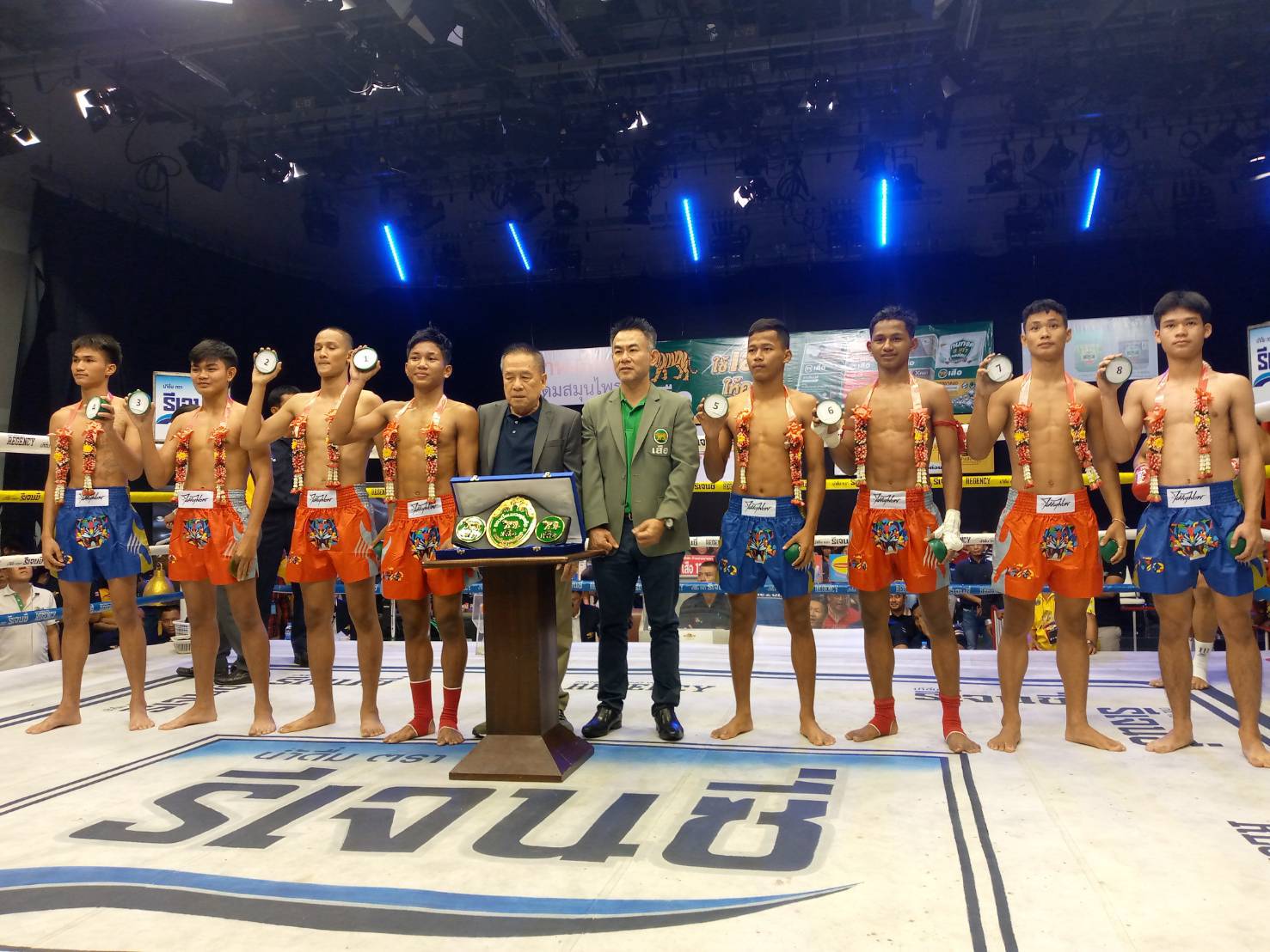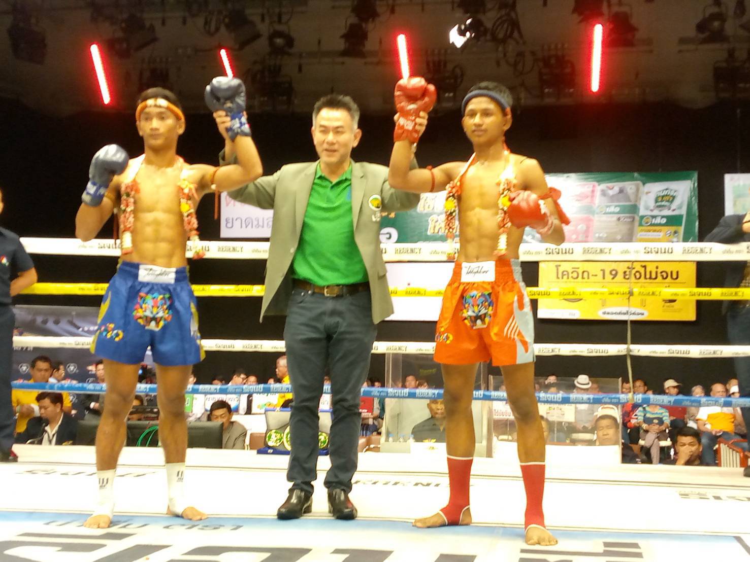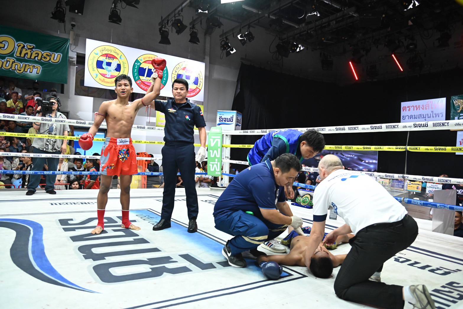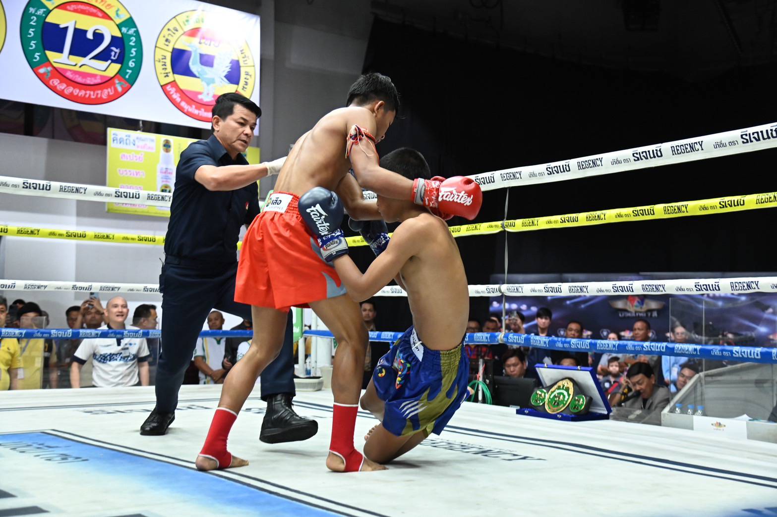 คู่ที่ 1. น็อคยก 2 ก้องสนั่น ส.เทียนโพธิ์ (แดง) พบกับ จ่ากล้า ศูนย์กีฬาห้วยต้ม (น้ำเงิน) ใครแพ้ตกรอบ ก้องสนั่น อาศัยตัวเล็กกว่าเดินเข้าหาเตะขวาลำตัว ด้าน จ่ากล้า สูงยาวเข่าแหลมต้นยก 2 ก้องสนั่น เดินจับในเหนียวแน่นปล้ำตีเข่าข้างเดียวทำเอา จ่ากล้า ดิ้นไม่หลุดทิ้งตัวลงไปนอนให้กรรมการนับ 8 ชกต่อได้ ก้องสนั่น ได้โอกาสเดินจับตีเข่าเป็นชุดฝ่ายเดียว จ่ากล้า ทนไม่ไหวทิ้งตัวนอนให้กรรมการนับ 10 ทันทีทำให้ ก้องสนั่น ส.เทียนโพธิ์ เป็นฝ่ายชนะ TKO ยก 2 ผ่านเข้ารอบ 8 คน ส่วน จ่ากล้า ตกรอบ