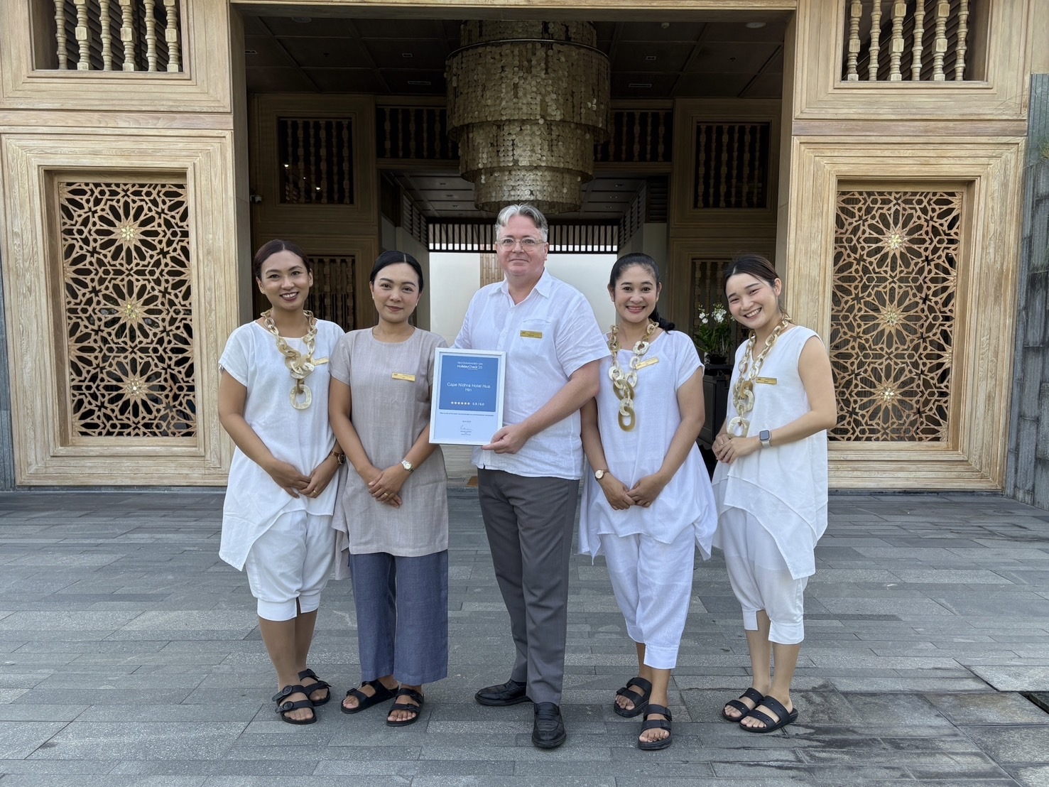 คริสเตียน เริลช์ลิ (คนที่ 3 จากซ้าย) ผู้จัดการทั่วไปโรงแรมเคปนิทรา หัวหิน พร้อมด้วยพนักงานโรงแรมฯ อาทิ ปัฐมขวัญ ฤทธิ์สีดานันท์ (คนที่ 4 จากซ้าย) ผู้จัดการแผนกต้อนรับ, อุทัย บุญส่ง (คนที่ 2 จากซ้าย) ผู้จัดการห้องอาหาร, ศิริวรรณ อินทร์พิทักษ์ (คนที่ 1 จากซ้าย) หัวหน้างานต้อนรับ และ วิมลฉัตร จิระธนากร (คนที่ 5 จากซ้าย) พนักงานต้อนรับ ร่วมกันแสดงความยินดีที่โรงแรมเคปนิทรา หัวหิน ได้รับรางวัล HolidayCheck Award 2025 จาก HolidayCheck ซึ่งรางวัลนี้มอบให้แก่ที่พักที่ได้รับความนิยมสูงสุดทั่วโลกในแต่ละปี โดยโรงแรมเคปนิทรา หัวหินได้คะแนนสูงถึง 5.9 จาก 6 ณ โรงแรมเคปนิทรา หัวหิน