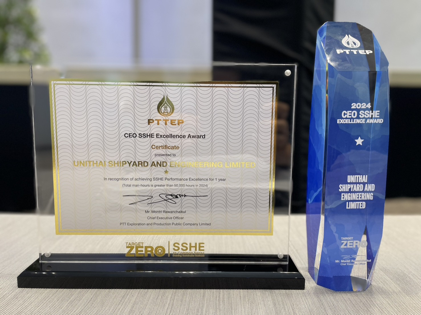 เรือเอก อภิเชษฐ์ บุญเผื่อน ผู้ช่วยกรรมการผู้จัดการและผู้อำนวยการฝ่ายปฏิบัติการ บริษัท ยูนิไทยชิปยาร์ด แอนด์ เอนจิเนียริ่ง จำกัด (UTSE) เป็นผู้แทนรับมอบรางวัล "CEO SSHE Excellence Award 2024" ในงาน SSHE Forum ซึ่งจัดโดยบริษัท ปตท.สำรวจและผลิตปิโตรเลียม จำกัด (มหาชน) หรือ PTTEP ณ พารากอนฮอลล์ ศูนย์การค้าสยามพารากอนรางวัลดังกล่าวมอบให้แก่ผู้นำที่แสดงถึงความเป็นเลิศในการบริหารจัดการด้าน ความปลอดภัย อาชีวอนามัย ความมั่นคง และสิ่งแวดล้อม (SSHE) ในสถานประกอบการ โดยพิจารณาจากแนวทางปฏิบัติที่เคร่งครัดและมีประสิทธิภาพ SSHE Forum เป็นเวทีที่รวบรวมผู้นำในอุตสาหกรรม ผู้รับเหมา และซัพพลายเออร์ที่มีความมุ่งมั่นร่วมกันในการยกระดับมาตรฐานด้านความปลอดภัยและความยั่งยืนอย่างต่อเนื่องการได้รับรางวัลในครั้งนี้ ถือเป็นอีกหนึ่งก้าวสำคัญของ ยูนิไทยชิปยาร์ดฯ ซึ่งสะท้อนถึงความทุ่มเทในการสร้างวัฒนธรรมความปลอดภัยในองค์กร และการส่งเสริมพฤติกรรมการทำงานที่ปลอดภัยในทุกระดับอย่างต่อเนื่อง บริษัท ยูนิไทยชิปยาร์ดฯ ยังคงเดินหน้าพัฒนาและขยายมาตรการด้านความปลอดภัยให้ครอบคลุมทุกบริการและลูกค้า พร้อมมุ่งมั่นทำงานร่วมกันเพื่อบรรลุความเป็นเลิศด้าน SSHE สร้างอนาคตที่มั่นคงและปลอดภัยสำหรับทุกคนทั้งนี้ SSHE (Safety, Security, Health and Environment) ถือเป็นหัวใจสำคัญในวัฒนธรรมองค์กรของ PTTEP และเป็นพันธกิจหลักที่ทุกภาคส่วนยึดถืออย่างจริงจัง