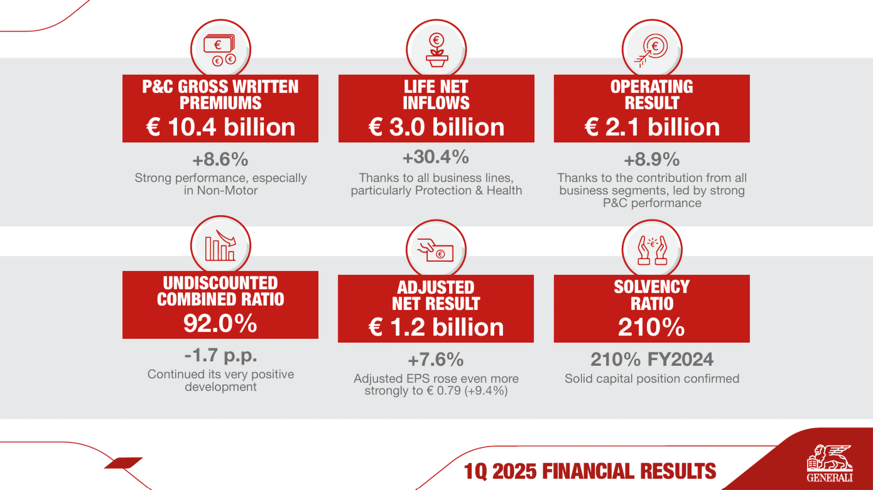 เจนเนอราลี่ กรุ๊ป เผยภาพรวมผลประกอบการไตรมาสแรกปี 2025 เบี้ยประกันภัยรับรวม 9.83 แสนล้านบาท เพิ่มขึ้น 0.2% เมื่อเทียบกับช่วงเดียวกันของปีก่อน โดยได้รับแรงหนุนจากผลการดำเนินงานที่แข็งแกร่งของธุรกิจประกันวินาศภัย เช่นเดียวกับกลุ่มธุรกิจประกันชีวิตโตต่อเนื่องทั้งกลุ่มประกันคุ้มครองและสุขภาพ การรักษาความแข็งแกร่งด้านเงินทุน (Solvency II Ratio) อยู่ที่ระดับ 210% มีกำไรสุทธิหลังปรับปรุงเพิ่ม 44.5 พันล้านบาท สะท้อนถึงความสำเร็จจากการดำเนินงานภายใต้กลยุทธ์ใหม่ “Lifetime Partner 27: Driving Excellence” มุ่งยกระดับความสัมพันธ์กับลูกค้า พัฒนาขีดความสามารถหลักขององค์กร และเสริมสร้างประสิทธิภาพในการบริหารจัดการในระดับกลุ่ม มร.คริสเตียโน่ โบเรียน (Mr.Cristiano Borean) ประธานเจ้าหน้าที่ฝ่ายการเงิน เจนเนอราลี่ กรุ๊ป กล่าวว่า “ในไตรมาสแรกนี้ เจนเนอราลี่ยังคงเติบโตอย่างแข็งแกร่งทั้งในด้านผลการดำเนินงานและผลลัพธ์สุทธิที่ปรับปรุงแล้ว ซึ่งถือเป็นการเริ่มต้นที่ดีมากสำหรับแผนกลยุทธ์ใหม่ ‘Lifetime Partner 27: Driving Excellence’ ด้วยแรงสนับสนุนจากทุกกลุ่มธุรกิจ โดยเฉพาะธุรกิจประกันวินาศภัย (P&C) ที่ได้รับประโยชน์จากการเติบโตของรายได้ที่แข็งแกร่ง ในกลุ่มประกันที่ไม่ใช่รถยนต์ (Non-Motor) รวมถึงการปรับปรุงอย่างต่อเนื่องของอัตราส่วนรวม (Combined Ratio) โดยในส่วนของธุรกิจประกันชีวิต มีเงินไหลเข้าสุทธิอย่างมีนัยสำคัญ โดยเฉพาะกลุ่มผลิตภัณฑ์ที่เราให้ความสำคัญด้านความคุ้มครอง และสุขภาพ รวมถึงผลิตภัณฑ์ประกันควบการลงทุนอย่างยูนิตลิงค์ ต่างก็มีผลการดำเนินงานที่แข็งแกร่ง นอกจากนี้ ในส่วนธุรกิจการจัดการสินทรัพย์และความมั่งคั่ง (Asset & Wealth Management) มีส่วนสนับสนุนผลการดำเนินงานของกลุ่มอย่างมั่นคง โดยเฉพาะจากการควบรวมกิจการของ Conning Holdings Limited ที่ช่วยเพิ่มผลกำไรจากแหล่งที่หลากหลายและสถานะเงินทุนที่แข็งแกร่งจากการสร้างกระแสเงินสดที่ยอดเยี่ยม จะช่วยให้กลุ่มสามารถดำเนินแผนกลยุทธ์ใหม่ได้อย่างประสบความสำเร็จ และสร้างคุณค่าให้กับผู้มีส่วนได้ส่วนเสียทุกฝ่าย โดยในไตรมาสแรกของปี 2025 นี้ เจนเนอราลี่ กรุ๊ป สามารถสร้างการเติบโตอย่างต่อเนื่องเมื่อเทียบกับช่วงเดียวกันของปีก่อน โดยมี เบี้ยประกันภัยรับรวม อยู่ที่ประมาณ 9.83 แสนล้านบาท (€ 26.5 พันล้านยูโร) เพิ่มขึ้น 0.2% ซึ่งได้รับแรงหนุนจากผลการดำเนินงานที่แข็งแกร่งของธุรกิจประกันวินาศภัย (+8.6%) โดยเฉพาะในกลุ่มที่ไม่เกี่ยวกับยานยนต์ ขณะที่ธุรกิจประกันชีวิต (Life) มียอดเงินไหลเข้าสุทธิ (Net Inflows) อยู่ที่ประมาณ 1.12 แสนล้านบาท (€ 3 พันล้านยูโร, + 30.4%) โดยกลุ่มผลิตภัณฑ์ด้านความคุ้มครองและสุขภาพ