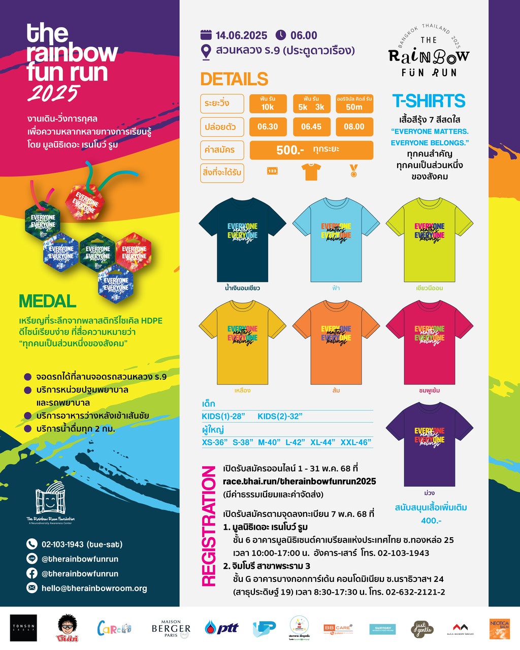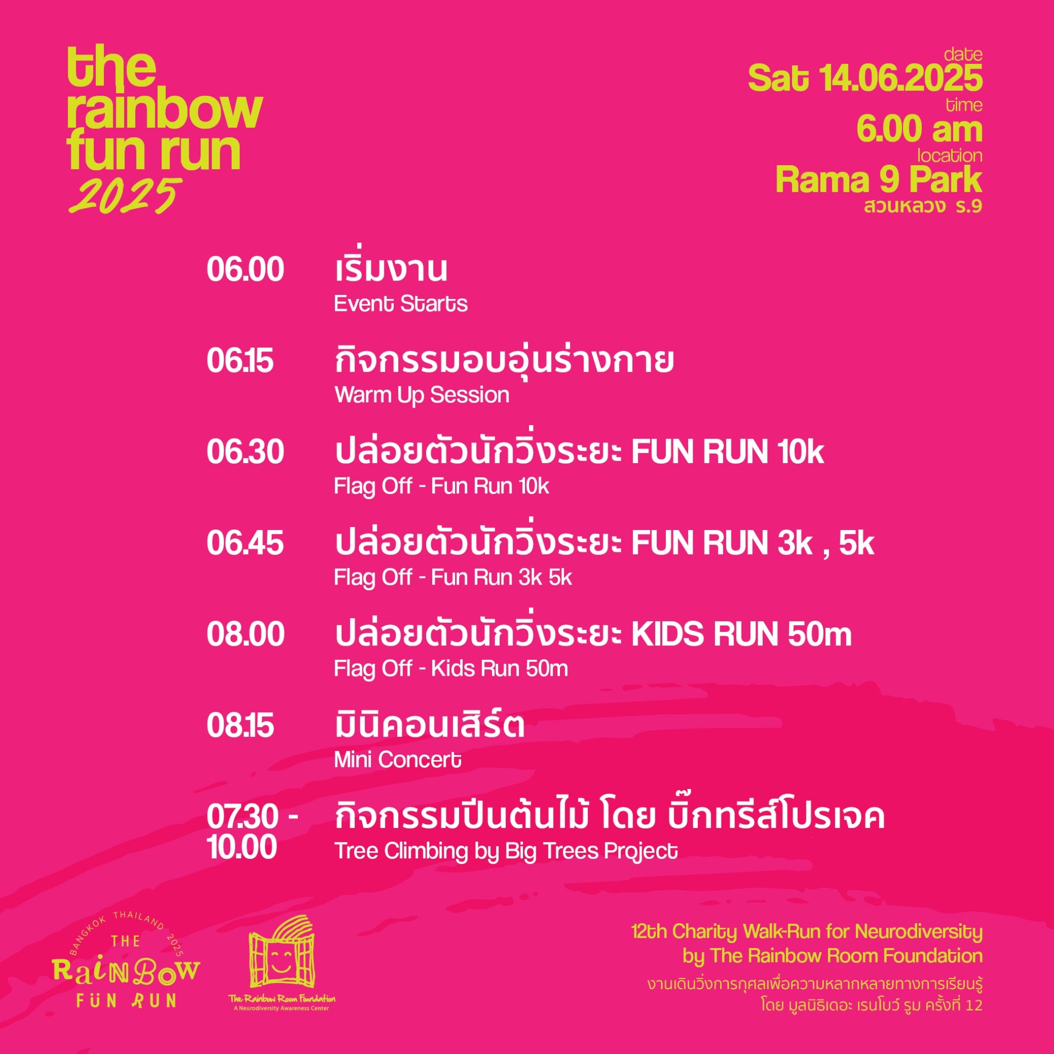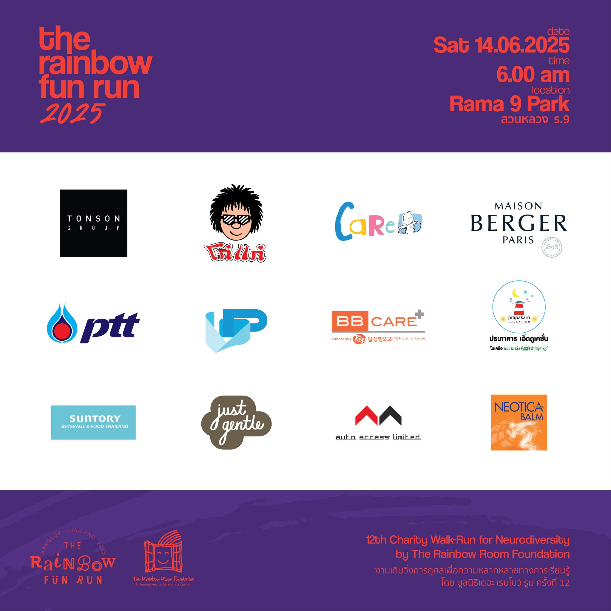 Maison Berger Paris (ประเทศไทย) ขอเชิญชวนทุกท่านร่วมเป็นส่วนหนึ่งในงานวิ่ง The Rainbow Fun Run 2025 งานเดินวิ่ง-การกุศลเพื่อความหลากหลายทางการเรียนรู้ โดย มูลนิธิเดอะ เรนโบว์ รูม ภายใต้แนวคิด “Everyone Matters. Everyone Belongs” ทุกคนสำคัญ ทุกคนเป็นส่วนหนึ่งของสังคม ในวันเสาร์ที่ 14 มิถุนายน 2568 ณ สวนหลวง ร.9 ลานหน้าประตูดาวเรือง ประเภท Fun Run 3, 5, 10 กม. เริ่มงานเวลา 6.00 น. ปล่อยตัว 06.30 น. และประเภท Original Kids Run 50 เมตร สำหรับนักวิ่งรุ่นเยาว์ ปล่อยตัว 8.00 น. ค่าสมัคร 500 บาท แจกฟรี!! 100 ท่านแรก ร่วมรับของสัมมนาคุณสุดพิเศษ ที่บูธ Maison Berger Paris ในวันงาน