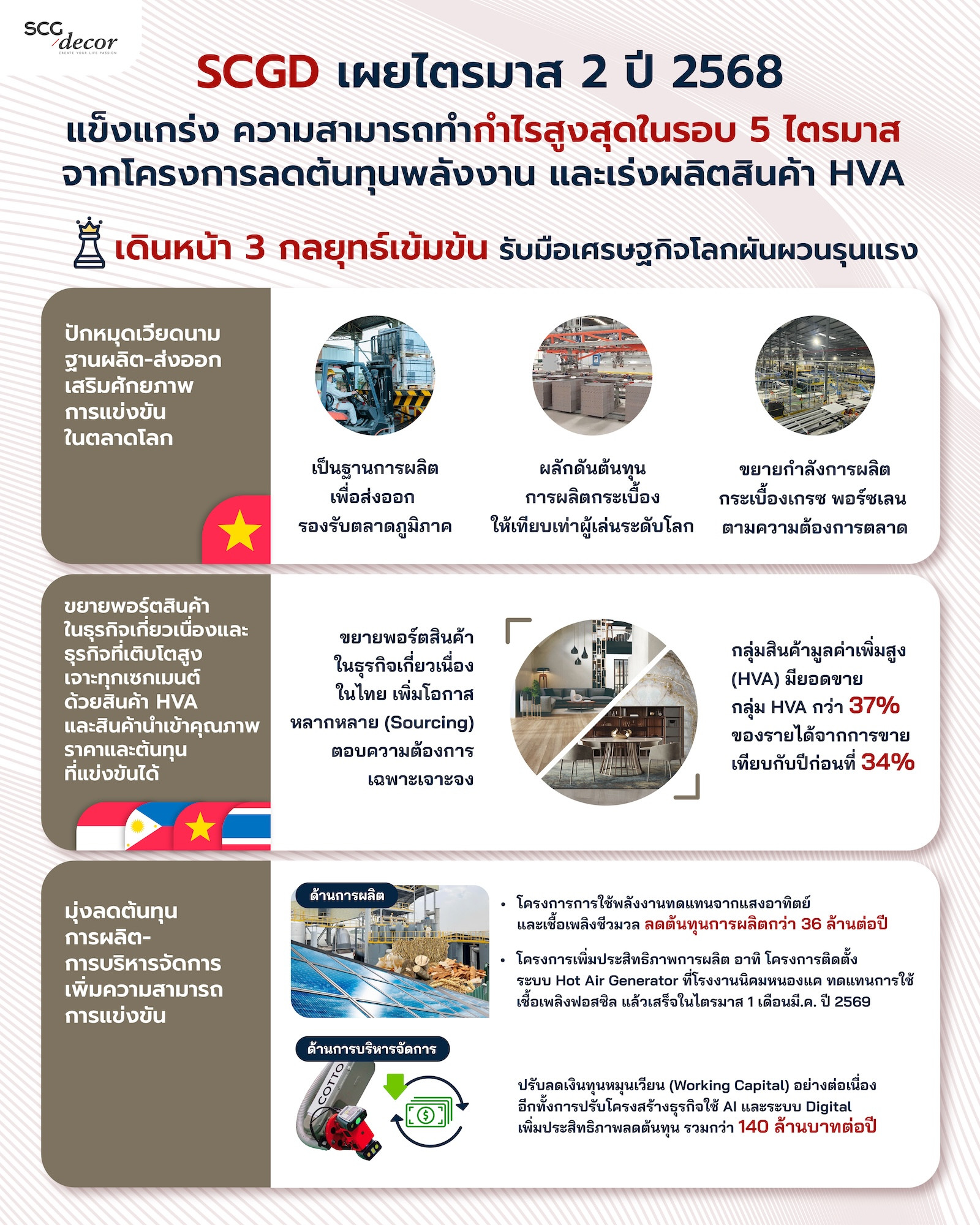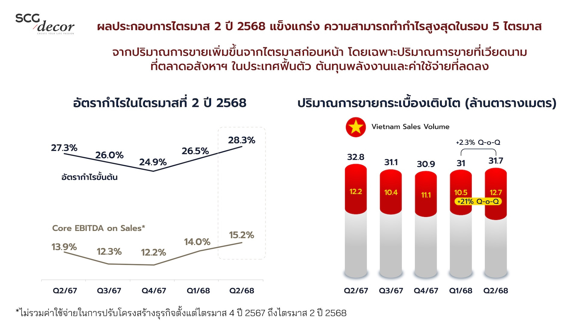 enjoyjam.net » news & activity » news & activity (Moderators: happy, sianbun) » SCGD เผยไตรมาส 2 ปี 2568 แข็งแกร่ง ความสามารถทำกำไรสูงสุดในรอบ 5 ไตรมาส « previous next » Print Pages: [1] Go Down happy on July 30, 2025, 09:28:32 PM SCGD เผยไตรมาส 2 ปี 2568 แข็งแกร่ง ความสามารถทำกำไรสูงสุดในรอบ 5 ไตรมาส ยกระดับกลยุทธ์เข้มข้น ปักหมุดเวียดนามฐานผลิตหลัก-หนุนส่งออก เร่ง HVA ธุรกิจสินค้าเกี่ยวเนื่อง เพิ่มมูลค่า มุ่งลดต้นทุนการผลิต-บริหารจัดการ ขยายพอร์ตสินค้ารับดีมานด์ตลาดภูมิภาคโต 30 กรกฎาคม 2568 – SCGD เผยผลประกอบการไตรมาส 2 ปี 2568 แข็งแกร่งขึ้น มีความสามารถทำกำไรต่อเนื่อง เทียบไตรมาสก่อน กำไรไม่รวมค่าใช้จ่ายปรับโครงสร้างธุรกิจ 283 ล้านบาท เพิ่มขึ้น 19% จากโครงการลดต้นทุนพลังงาน เตรียมคว้าโอกาสจากการฟื้นตัวของตลาดอสังหาฯ ในเวียดนาม และเพิ่มความสามารถในการแข่งขันในตลาดโลก เร่งผลิตและจัดหาสินค้า HVA และสินค้าเกี่ยวเนื่องเดินหน้าปรับตัวฉับไวรับมือเศรษฐกิจผันผวนรุนแรง ชู 3 กลยุทธ์เข้มข้น 1.) ปักหมุดเวียดนามเป็นฐานการผลิต-ส่งออก เสริมศักยภาพการแข่งขันในตลาดโลก ทั้งด้านต้นทุนการผลิต และด้านเพิ่มกำลังการผลิตกระเบื้องเกรซ พอร์ซเลน รองรับตลาดเติบโต 2.) ขยายพอร์ตสินค้าในธุรกิจเกี่ยวเนื่อง และธุรกิจที่มีการเติบโตสูง เจาะตลาดทุกเซกเมนต์ด้วยสินค้า HVA และสินค้านำเข้าคุณภาพ ราคาและต้นทุนที่แข่งขันได้ 3.) มุ่งลดต้นทุนการผลิตผ่านการปรับโครงสร้างธุรกิจและลดเงินทุนหมุนเวียนอย่างต่อเนื่อง เพิ่มขีดความสามารถในการแข่งขัน SCGD จ่ายปันผลเพิ่มเป็น 0.15 บาท เพื่อเป็นการดูแลผู้ถือหุ้น ในช่วงที่เศรษฐกิจผันผวนทั้งโลกและไทย และแสดงถึงความมั่นใจในธุรกิจที่เติบโต มีกระแสเงินสด และฐานะการเงินแข็งแกร่ง นายนำพล มลิชัย ประธานเจ้าหน้าที่บริหารและกรรมการผู้จัดการใหญ่ บริษัทเอสซีจี เดคคอร์ จำกัด (มหาชน) หรือ SCG Decor (SCGD) ผู้นำในธุรกิจเซรามิก วัสดุตกแต่งพื้นผิวและสุขภัณฑ์ ในภูมิภาคอาเซียน กล่าวว่า “ผลประกอบการไม่รวมค่าใช้จ่ายในการปรับโครงสร้างธุรกิจในไตรมาส 2 ปี 2568 มี EBITDA อยู่ที่ 879 ล้านบาท เพิ่มขึ้นร้อยละ 5 จากไตรมาสก่อน มีกำไร 283 ล้านบาท เพิ่มขึ้นร้อยละ 19 จากไตรมาสก่อน จากโครงการลดต้นทุนพลังงาน เร่งผลิตสินค้ามูลค่าเพิ่มสูง (HVA) รวมถึงปรับโครงสร้างธุรกิจส่งผลให้บริษัทฯ มีค่าใช้จ่ายที่ลดลง บริษัทมี EBITDA on sales อยู่ที่ร้อยละ 15.2 และอัตรากำไรสุทธิอยู่ที่ร้อยละ 4.8 ซึ่งสูงสุดในรอบ 5 ไตรมาสที่ผ่านมา นับตั้งแต่ไตรมาส 2 ของปี 2567 นอกจากนี้ ปริมาณการขายกระเบื้องในไตรมาส 2 เพิ่มขึ้นอยู่ที่ 31.7 ล้านตารางเมตร โดยได้รับอานิสงส์จากการฟื้นตัวของตลาดภูมิภาคโดยเฉพาะในเวียดนาม ซึ่ง SCGD มีธุรก