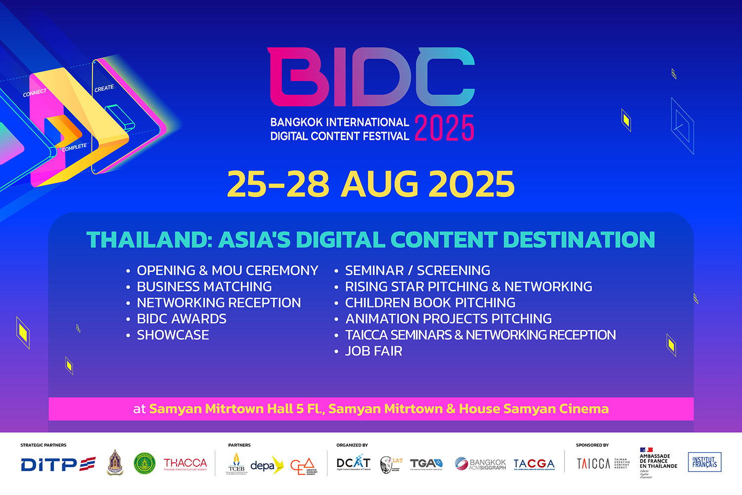ใกล้เข้ามาทุกทีสำหรับโครงการ บางกอกอินเตอร์เนชันแนล ดิจิทัลคอนเทนต์ เฟสติวัล 2025 (Bangkok International Digital Content Festival 2025) ปีที่ 12 ที่มุ่งยกระดับจาก "งานเทศกาล" สู่ "THAILAND: ASIA'S DIGITAL CONTENT DESTINATION" ด้วยการรวมกิจกรรมด้านดิจิทัลคอนเทนต์ไว้อย่างครบถ้วนภายในงานเดียว ทั้งการเจรจาการค้า การประกาศรางวัล BIDC AWARDS การสัมมนา–เสวนา การจัดแสดงภาพยนตร์ และการแสดงผลงานด้านดิจิทัลคอนเทนต์ ฯลฯ โดยจะจัดขึ้น ณ สามย่านมิตรทาวน์ฮอลล์ และโรงภาพยนตร์ House สามย่าน ระหว่างวันที่ 25 – 28 สิงหาคม 2568