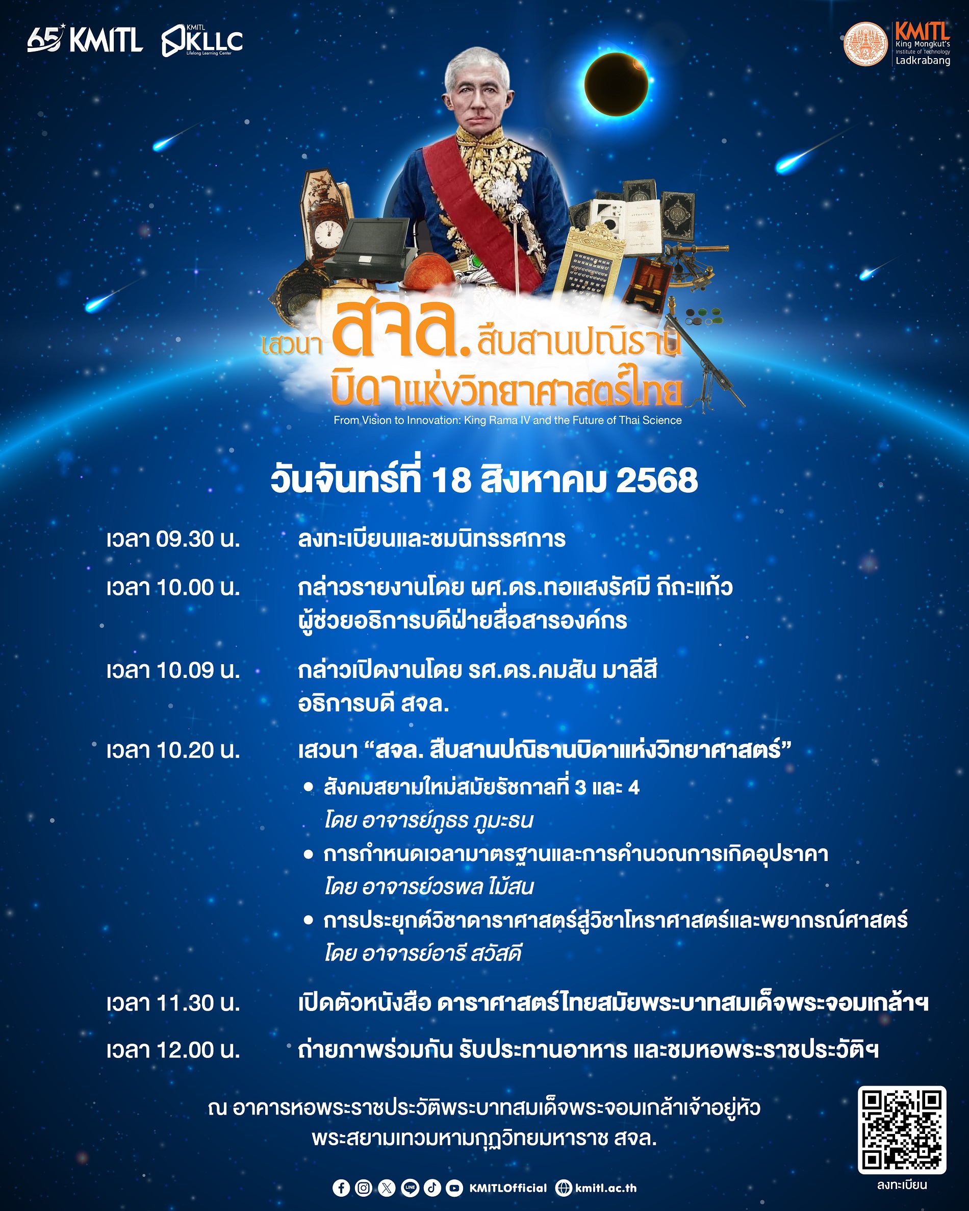สถาบันเทคโนโลยีพระจอมเกล้าเจ้าคุณทหารลาดกระบัง (สจล.) ขอเชิญชวนผู้สนใจเข้าร่วมงานเสวนาในหัวข้อ “สจล. สืบสานปณิธานบิดาแห่งวิทยาศาสตร์ไทย” (From Vision to Innovation: King Rama IV and the Future of Thai Science) เนื่องในโอกาสวันคล้ายวันสถาปนาสถาบันฯ ครบรอบ 65 ปี และวันวิทยาศาสตร์ไทย เพื่อเทิดพระเกียรติพระบาทสมเด็จพระจอมเกล้าเจ้าอยู่หัว รัชกาลที่ 4 “พระบิดาแห่งวิทยาศาสตร์ไทย” และส่งเสริมการเรียนรู้ด้านวิทยาศาสตร์ควบคู่กับประวัติศาสตร์ วัฒนธรรม และภูมิปัญญาไทย