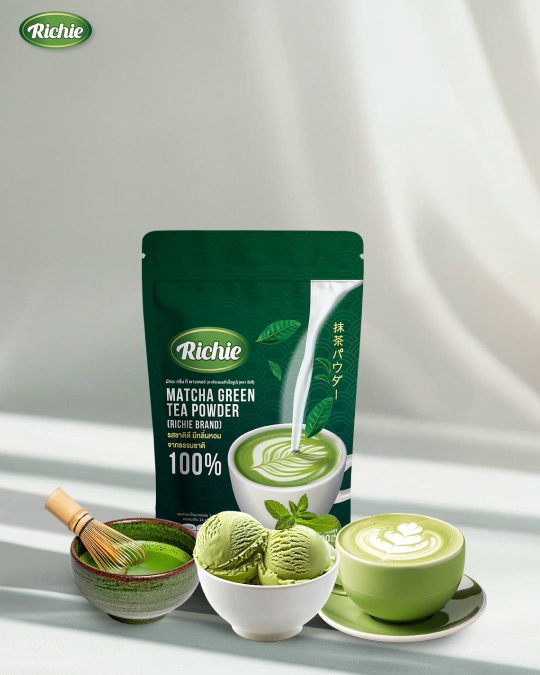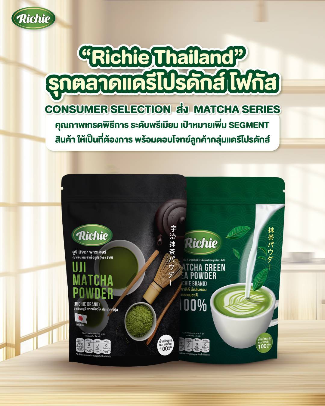 พร้อมกันนี้ชูความเป็นผู้นำ และ เป็นผู้เชี่ยวชาญการนำเข้าวัตถุดิบจากประเทศญี่ปุ่น โฟกัส Matcha Series เน้นขยายการเข้าถึงกลุ่มตลาดชาเขียวผ่านแบรนด์ Richie ชูความออริจินัล แพคเกจพรีเมียม เพียงเปิดซองคุณจะได้สัมผัส กลิ่นหอมของ ใบชาแท้ สีสวย วัตถุดิบแท้100% นำเข้าจากประเทศญี่ปุ่น เป็นชาเขียวผงสกัดที่นำไปใช้ได้ทุกความต้องการ Matcha Series ของเรามีจำนวน 2 ชนิด คือ Uji Matcha Powder ผงชาเขียวคุณภาพสูงที่ผลิตจากเมืองอุจิ (Uji) จังหวัดเกียวโต ประเทศญี่ปุ่น โดยเป็นที่ยอมรับกันว่าเป็นมัทฉะที่ดีที่สุด และ ใช้เยอะในกลุ่มอุตสาหกรรมอาหารเครื่องดื่ม และ อีก1 ประเภทคือ Matcha Green Tea Powder ผงชาเขียวแท้จากญี่ปุ่น แบบบดละเอียดเลือกแต่ยอดใบชาต้นอ่อน นิยมใช้ในกลุ่มคาเฟ่ ร้านเครื่องดื่ม เบเกอรี่ต่างๆ