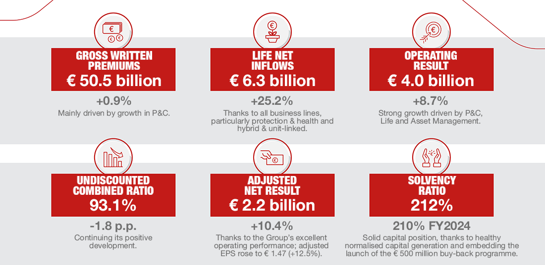 จากปัจจัยข้างต้น ส่งผลให้เจนเนอราลี่ กรุ๊ปมี ผลกำไรจากการดำเนินงาน (Operating Result) อยู่ที่ 1.56 แสนล้านบาท (4 พันล้านยูโร) คิดเป็นกำไรสุทธิหลังปรับปรุง (Adjusted Net Result) อยู่ที่ 82.9 พันล้านบาท (2.2 พันล้านยูโร) เพิ่มขึ้น 10.4% ส่งผลให้กำไรต่อหุ้นที่ปรับปรุงแล้ว (Adjusted EPS) เพิ่มขึ้นเป็น 56.61 บาทต่อหุ้น (1.47 ยูโรต่อหุ้น) โดยเพิ่มขึ้น 12.5% เมื่อเทียบกับครึ่งปีแรกของปี 2024 และยังคงรักษาสถานะทางการเงินที่แข็งแกร่ง ด้วยอัตราส่วนความมั่นคงทางการเงิน (Solvency Ratio) อยู่ที่ 212% ซึ่งสะท้อนถึงศักยภาพในการบริหารความเสี่ยง การจัดสรรทุนอย่างมีประสิทธิภาพ รวมถึงผลของโครงการซื้อหุ้นคืนมูลค่า 500 ล้านยูโร โดยผลการดำเนินงานทั้งหมด แสดงให้เห็นถึงความพร้อมในการรองรับการเติบโตอย่างยั่งยืนในระยะยาว