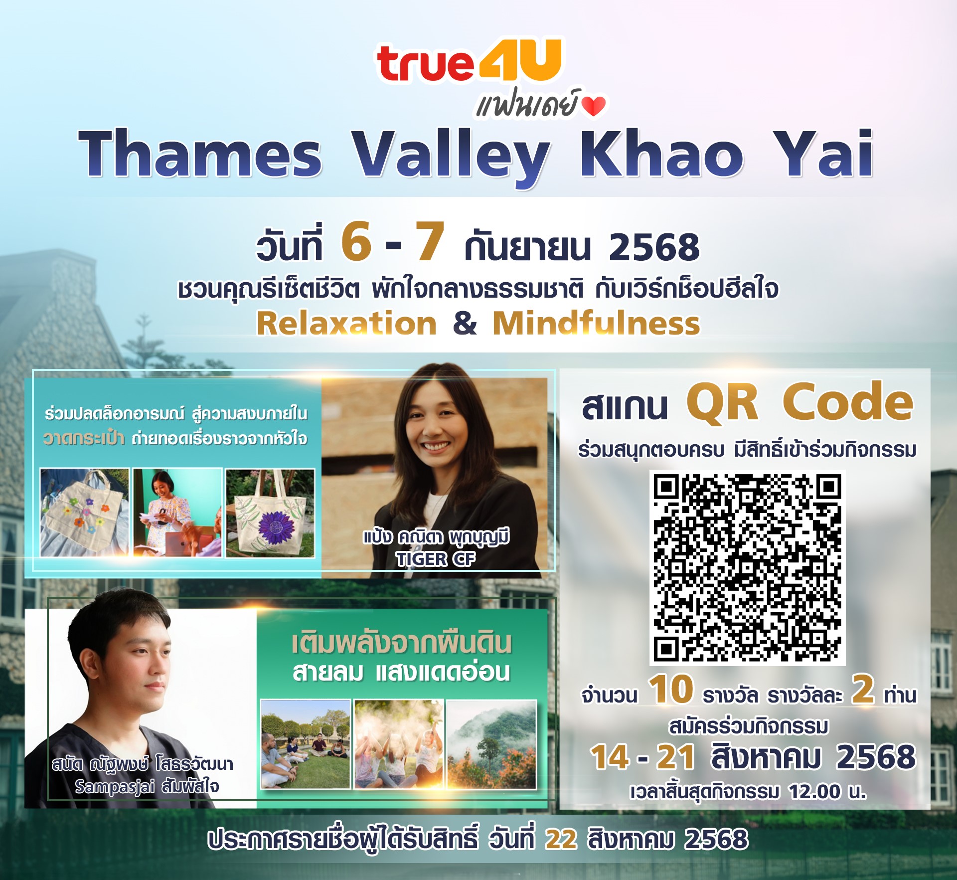 สถานีโทรทัศน์ทรูโฟร์ยู ช่อง 24 เดินหน้าสานต่อกิจกรรมเพื่อผู้ชมภายใต้โครงการ “True4U แฟนเดย์” ร่วมกับ “โรงแรมเทมส์ วัลลีย์ เขาใหญ่” รีสอร์ทหรูสไตล์อังกฤษท่ามกลางขุนเขาและธรรมชาติอันร่มรื่น จัดกิจกรรมเวิร์กช็อปเพื่อการผ่อนคลายและดูแลสุขภาพจิตใจ ภายใต้แนวคิด “Relaxation & Mindfulness” ในวันที่ 6–7 กันยายน 2568 กิจกรรมในครั้งนี้มุ่งเน้นการสร้างสมดุลภายในผ่านศิลปะและธรรมชาติบำบัด โดยผู้เข้าร่วมจะได้สัมผัสประสบการณ์การวาดกระเป๋าผ้า ถ่ายทอดเรื่องราวจากหัวใจ โดย ครูแป้ง – คณิดา พุกบุญมี นักสร้างสรรค์ผู้เชี่ยวชาญด้านศิลปะเพื่อการเยียวยา พร้อมทั้งร่วมเวิร์กช็อปธรรมชาติบำบัด (Nature Therapy) กับ คุณสนัด – ณัฐพงษ์ โสธรวัฒนา เจ้าของเพจ Sampasjai และนักออกแบบกิจกรรมเพื่อการเรียนรู้และดูแลจิตใจ ที่จะพาผู้เข้าร่วมสัมผัสพลังแห่งธรรมชาติจากผืนดิน แสงแดด และสายลม เพื่อคลายความเครียดและเสริมสร้างความสงบภายใน ผู้ที่สนใจสามารถร่วมลุ้นสิทธิ์เข้าร่วมกิจกรรมได้โดยง่าย เพียงสแกน QR Code หรือกดลิ้งค์ https://forms.gle/r9w2gFDAY6dyJF2MA และตอบคำถามว่า “คุณมีวิธีดูแลสุขภาพจิตใจในชีวิตประจำวันอย่างไรบ้าง”จากนั้นกดไลก์และแชร์โพสต์กิจกรรมบนเฟซบุ๊กแฟนเพจทรูโฟร์ยู (ตั้งค่าเป็นสาธารณะ) โดยคำตอบที่ครบถ้วนมากที่สุด จะได้รับสิทธิ์เข้าร่วมกิจกรรม จำนวน 10 รางวัล (รางวัลละ 2 ท่าน) รวมทั้งสิ้น 20 ที่นั่ง เปิดรับคำตอบตั้งแต่วันนี้ถึงวันที่ 21 สิงหาคม 2568 เวลา 12.00 น. และจะประกาศรายชื่อผู้ได้รับสิทธิ์ในวันที่ 22 สิงหาคม 2568 ผ่านทาง Facebook Fanpage : True4U