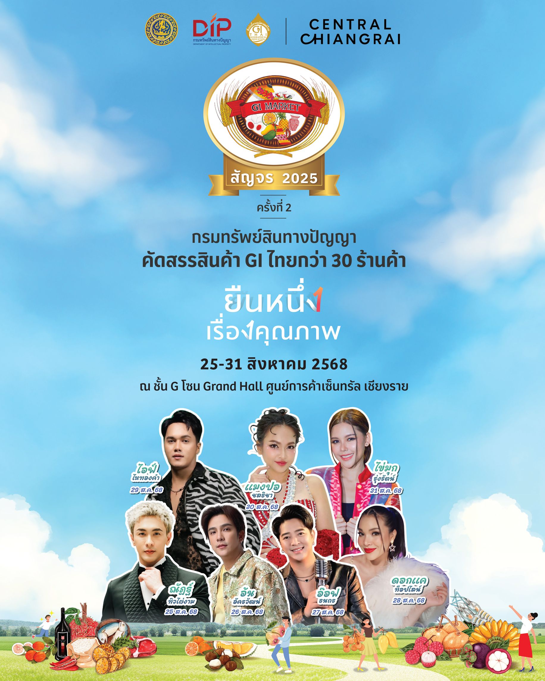 กรมทรัพย์สินทางปัญญา เดินหน้าส่งเสริมสินค้า GI ต่อเนื่องขึ้นเหนือ เตรียมจัดใหญ่ GI Market สัญจร 2025 ครั้งที่ 2 ตอกย้ำสินค้า GI ยืนหนึ่งเรื่องคุณภาพ คัดสรรสุดยอดสินค้า GI ไทย กว่า 30 ร้านค้า พร้อมทัพศิลปินมอบความบันเทิงคับคั่ง 25–31 สิงหาคมนี้ ณ ศูนย์การค้าเซ็นทรัลเชียงราย กรมทรัพย์สินทางปัญญา กระทรวงพาณิชย์ เตรียมจัดงาน “GI Market สัญจร 2025” ครั้งที่ 2 โดยรวบรวมสินค้า GI หลากหลายประเภท จากทุกภูมิภาคทั่วประเทศ มาจำหน่ายรวมกว่า 30 ร้านค้า ทั้งข้าว ผลไม้ อาหาร งานหัตถกรรม ผ้าและเครื่องแต่งกาย อาทิ ปลากุเลาเค็มตากใบ ส้มโอปูโกยะรัง ส้มควายภูเก็ต ไชโป้วโพธาราม ไข่เค็มไชยา ผ้ากาบบัวอุบลราชธานี ผ้าครามธรรมชาติสกลนคร เครื่องปั้นดินเผาบ้านเชียง ครกหินแกรนิตตาก เครื่องเคลือบเวียงกาหลง และสินค้าอัตลักษณ์เฉพาะถิ่นอีกมากมาย ผู้สนใจสามารถมาเลือกช้อปสินค้าคุณภาพ ของฝากเอกลักษณ์เฉพาะถิ่น พร้อมเพลิดเพลินกับมินิคอนเสิร์ตจากศิลปินลูกทุ่งมากมายตลอด 7 วันเต็ม ทั้ง ณัฏฐ์ ทิวไผ่งาม อ้น อัครวัฒน์ อ๊อฟ ธนกร ดอกแค ท็อปไลน์ ไอฟ์ ไหทองคำ แมงปอ ชลธิชา และไข่มุก รุ่งรัตน์ โดยงานจัดขึ้นระหว่างวันที่ 25 - 31 สิงหาคม 2568 ชั้น G โซน Grand Hall ศูนย์การค้าเซ็นทรัลเชียงราย สำหรับการจัดงาน “GI Market สัญจร 2025” ครั้งที่ 2 นี้ นับเป็นอีกหนึ่งกลไกสำคัญ ในการส่งเสริมและยกระดับศักยภาพ ตลอดจนการสร้างโอกาส สร้างรายได้ให้กับเกษตรกร ผู้ผลิต ผู้ประกอบการ GI ขณะเดียวกันยังเป็นการสร้างการรับรู้ให้กับผู้บริโภคได้เลือกซื้อสินค้า GI ที่ส่งตรงจากแหล่งผลิต ซึ่งกรมทรัพย์สินทางปัญญา ได้ดำเนินการส่งเสริมการควบคุมคุณภาพสินค้า GI เพื่อรักษาคุณภาพ และอัตลักษณ์ของสินค้า GI ทำให้ผู้บริโภคมั่นใจได้ว่า สินค้า GI ไทย ได้รับการการันตีคุณภาพและรับประกันว่าเป็นสินค้าที่ผลิตจากแหล่งภูมิศาสตร์อย่างแท้จริง