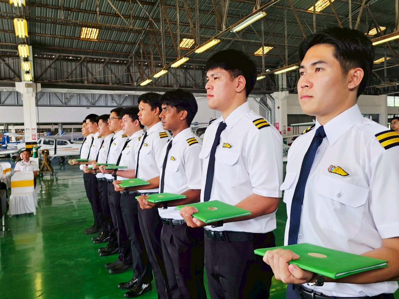 นางสาวภัคณัฏฐ์ มากช่วย ผู้ว่าการสถาบันการบินพลเรือน (สบพ.) เป็นประธานในพิธีประดับเครื่องหมายแสดงความสามารถในการบิน (ครึ่งปีก) และมอบประกาศนียบัตรให้แก่ศิษย์การบินหลักสูตรนักบินพาณิชย์ตรี- เฮลิคอปเตอร์ รุ่นที่ HP-56 จำนวน 9 นาย เมื่อวันที่ 19 สิงหาคม 2568 ณ ศูนย์ฝึกการบิน อำเภอหัวหิน จังหวัดประจวบคีรีขันธ์ ภายในพิธีได้รับเกียรติจากผู้บริหารระดับสูง อาทิ ผู้อำนวยการศูนย์ฝึกการบิน ผู้อำนวยการกองฝึกบิน ผู้อำนวยการกองซ่อมบำรุงอากาศยาน คณะครูการบิน นักบิน และครูวิชาภาคพื้น เข้าร่วมแสดงความยินดี พร้อมชื่นชมในความมุ่งมั่นและความสำเร็จของศิษย์การบินที่สามารถก้าวผ่านการฝึกฝนอย่างเข้มข้นทั้งภาคพื้นและภาคอากาศ จนบรรลุตามมาตรฐานสากลด้านการบิน พิธีประดับครึ่งปีกถือเป็นอีกหนึ่งก้าวสำคัญในเส้นทางการเป็นนักบินมืออาชีพ โดยเฉพาะในยุคปัจจุบันที่ประเทศไทยและภูมิภาคอาเซียนมีความต้องการบุคลากรด้านการบินเพิ่มสูงขึ้นอย่างต่อเนื่อง ทั้งในภาคการขนส่งทางอากาศเชิงพาณิชย์ การบินทั่วไป ตลอดจนภารกิจด้านความมั่นคงและการกู้ภัย เฮลิคอปเตอร์จึงนับเป็นอากาศยานที่มีบทบาทสำคัญอย่างยิ่ง การผลิตนักบินเฮลิคอปเตอร์คุณภาพจากสถาบันการบินพลเรือน จึงไม่เพียงตอบสนองต่อนโยบายของรัฐบาลในการพัฒนาทรัพยากรบุคคลด้านการบินให้สอดคล้องกับมาตรฐานสากล แต่ยังช่วยเสริมสร้างศักยภาพการแข่งขันของประเทศในอุตสาหกรรมการบินและโลจิสติกส์ที่กำลังเติบโต