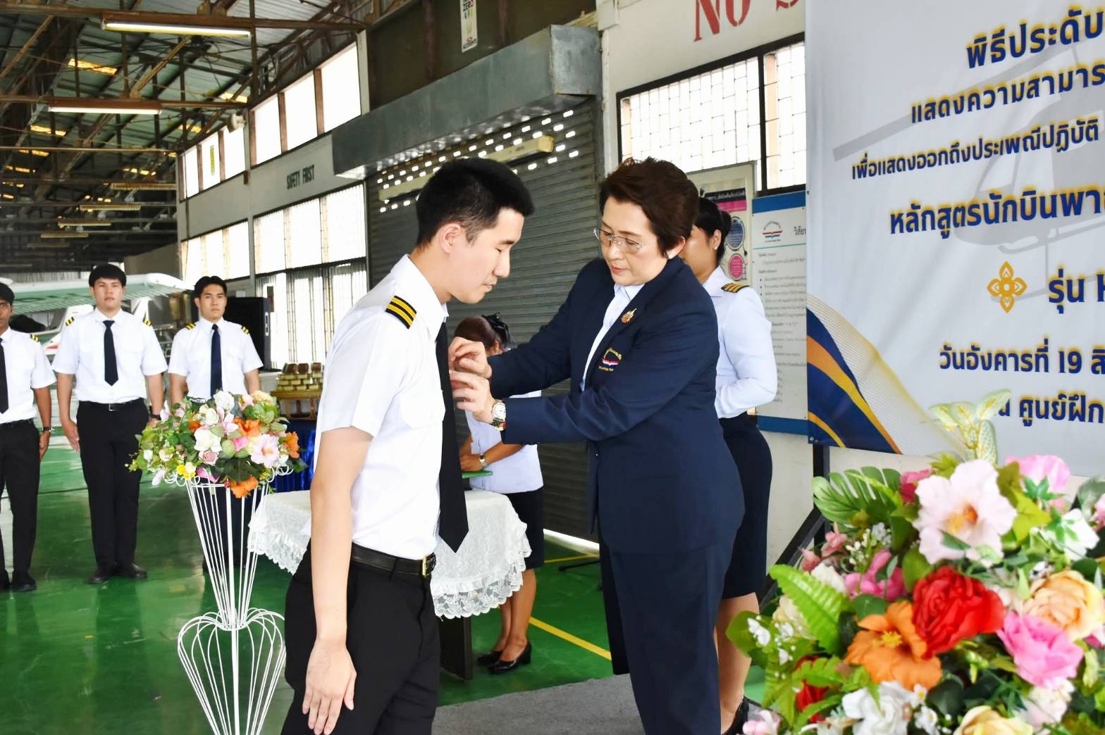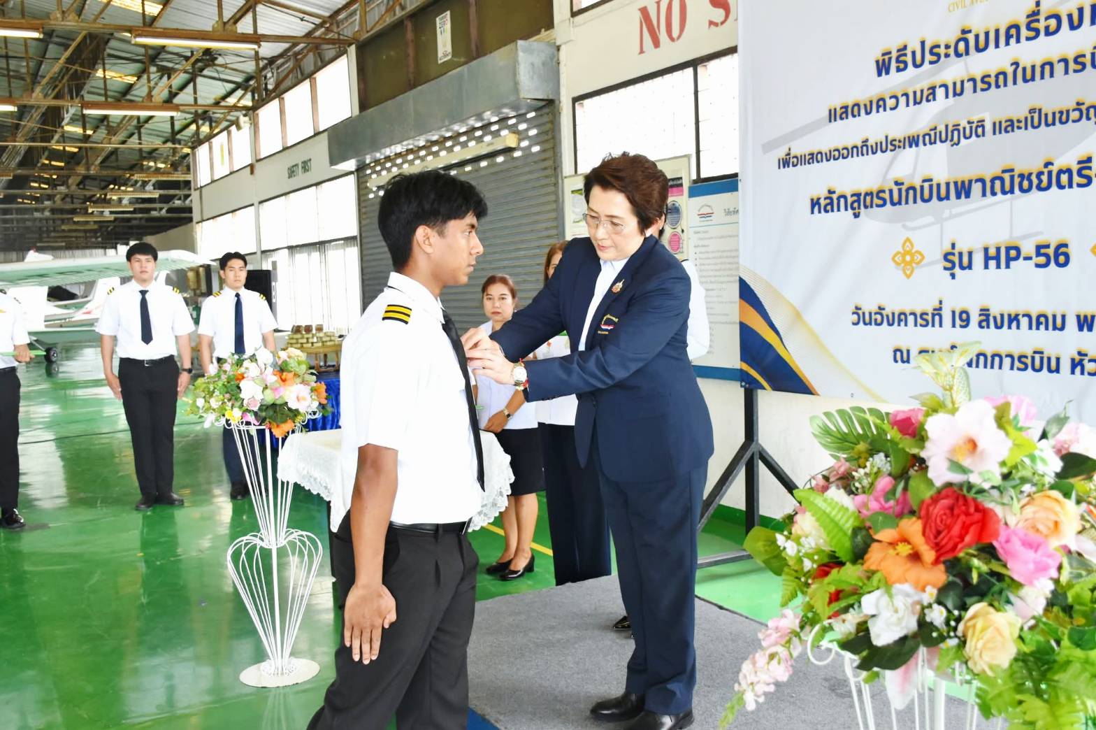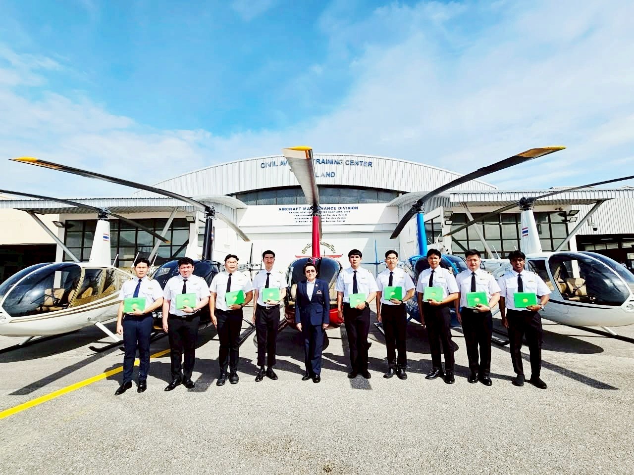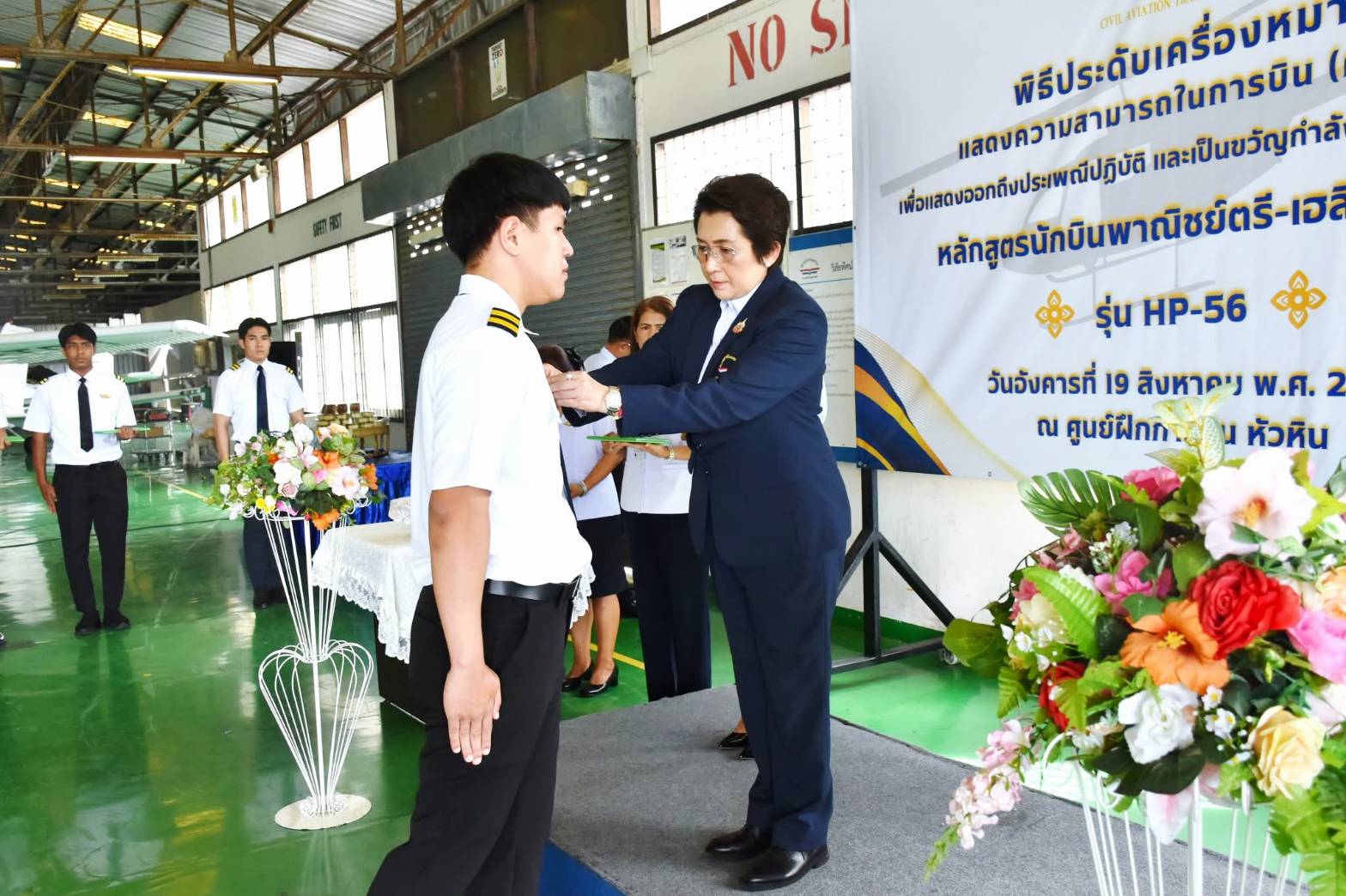 นางสาวภัคณัฏฐ์ มากช่วย ผู้ว่าการสถาบันการบินพลเรือน (สบพ.) เป็นประธานในพิธีประดับเครื่องหมายแสดงความสามารถในการบิน (ครึ่งปีก) และมอบประกาศนียบัตรให้แก่ศิษย์การบินหลักสูตรนักบินพาณิชย์ตรี- เฮลิคอปเตอร์ รุ่นที่ HP-56 จำนวน 9 นาย เมื่อวันที่ 19 สิงหาคม 2568 ณ ศูนย์ฝึกการบิน อำเภอหัวหิน จังหวัดประจวบคีรีขันธ์ ภายในพิธีได้รับเกียรติจากผู้บริหารระดับสูง อาทิ ผู้อำนวยการศูนย์ฝึกการบิน ผู้อำนวยการกองฝึกบิน ผู้อำนวยการกองซ่อมบำรุงอากาศยาน คณะครูการบิน นักบิน และครูวิชาภาคพื้น เข้าร่วมแสดงความยินดี พร้อมชื่นชมในความมุ่งมั่นและความสำเร็จของศิษย์การบินที่สามารถก้าวผ่านการฝึกฝนอย่างเข้มข้นทั้งภาคพื้นและภาคอากาศ จนบรรลุตามมาตรฐานสากลด้านการบิน พิธีประดับครึ่งปีกถือเป็นอีกหนึ่งก้าวสำคัญในเส้นทางการเป็นนักบินมืออาชีพ โดยเฉพาะในยุคปัจจุบันที่ประเทศไทยและภูมิภาคอาเซียนมีความต้องการบุคลากรด้านการบินเพิ่มสูงขึ้นอย่างต่อเนื่อง ทั้งในภาคการขนส่งทางอากาศเชิงพาณิชย์ การบินทั่วไป ตลอดจนภารกิจด้านความมั่นคงและการกู้ภัย เฮลิคอปเตอร์จึงนับเป็นอากาศยานที่มีบทบาทสำคัญอย่างยิ่ง การผลิตนักบินเฮลิคอปเตอร์คุณภาพจากสถาบันการบินพลเรือน จึงไม่เพียงตอบสนองต่อนโยบายของรัฐบาลในการพัฒนาทรัพยากรบุคคลด้านการบินให้สอดคล้องกับมาตรฐานสากล แต่ยังช่วยเสริมสร้างศักยภาพการแข่งขันของประเทศในอุตสาหกรรมการบินและโลจิสติกส์ที่กำลังเติบโต