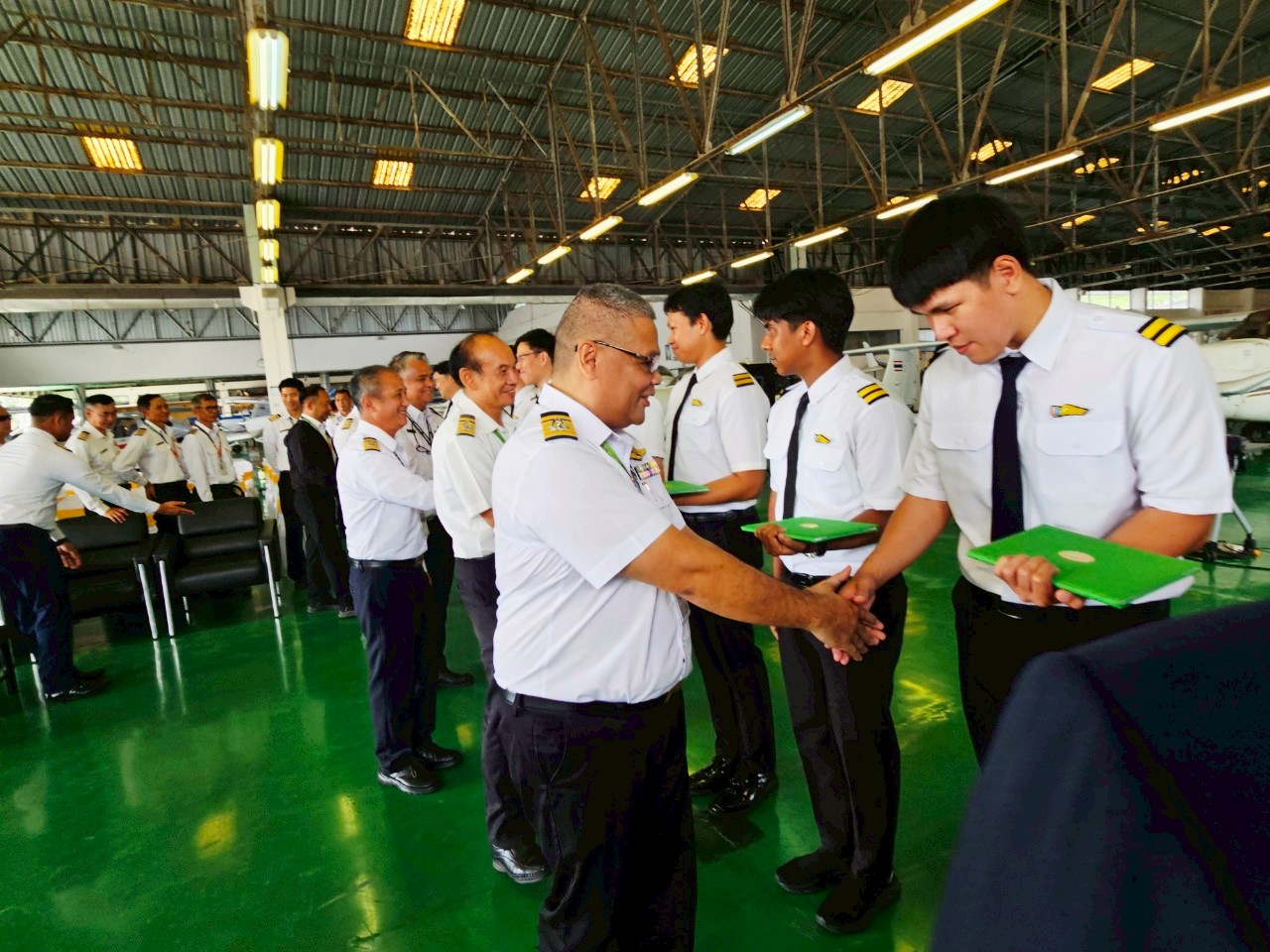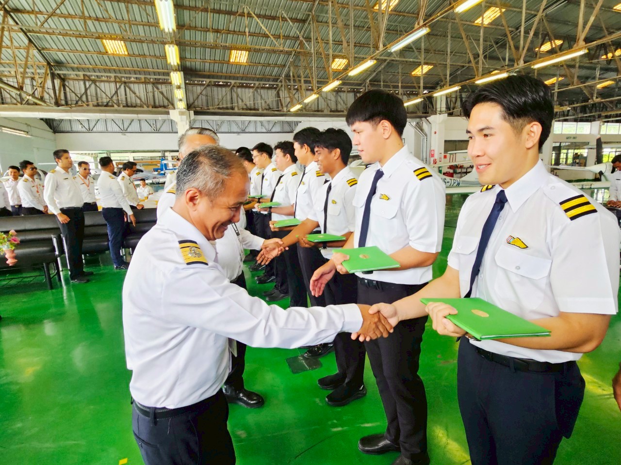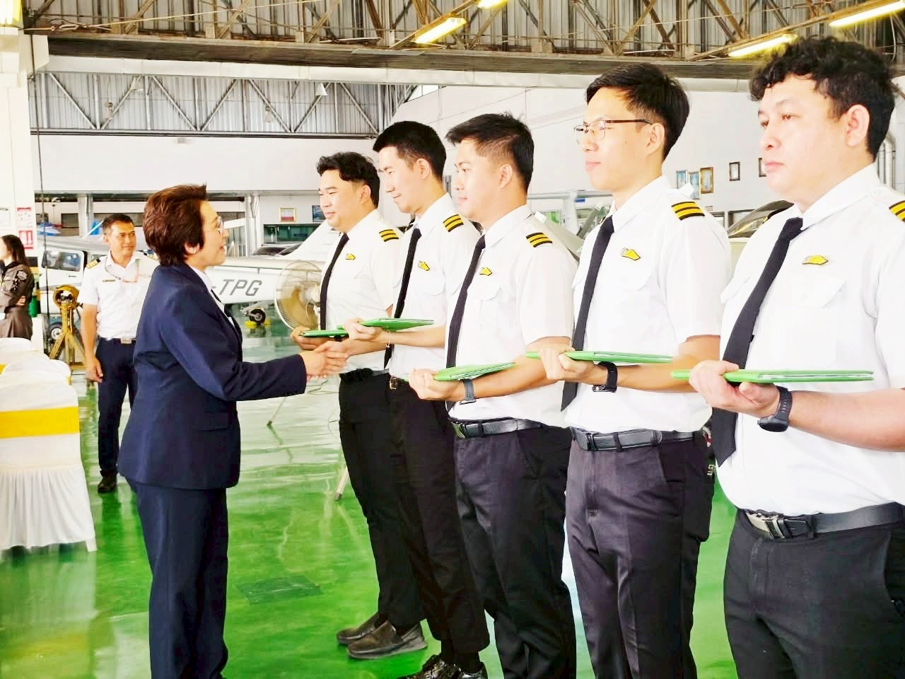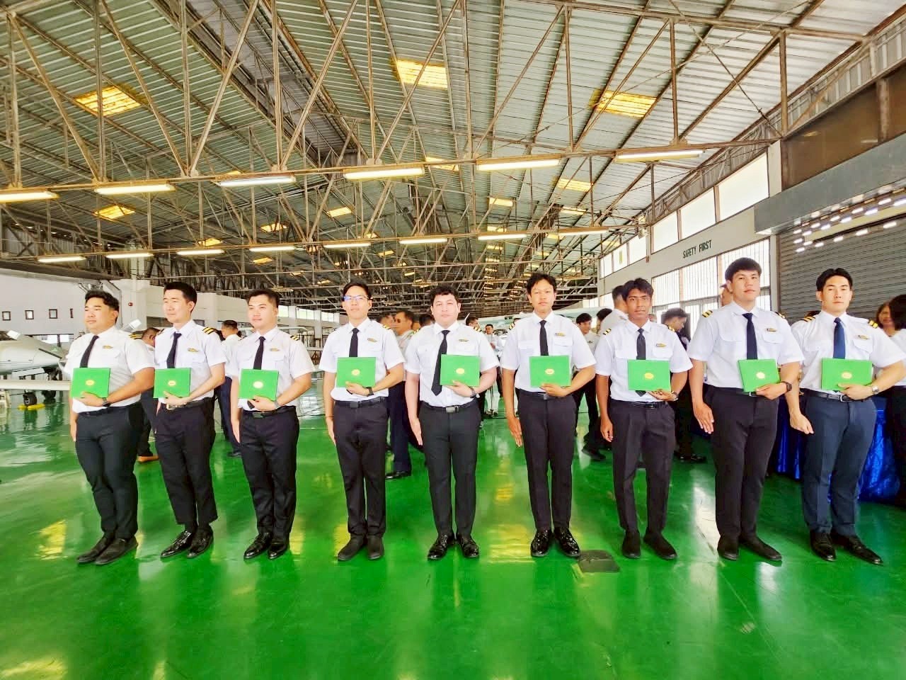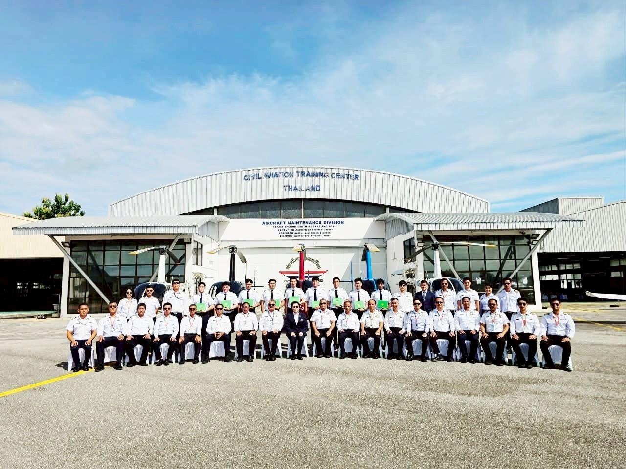 นางสาวภัคณัฏฐ์ มากช่วย ผู้ว่าการสถาบันการบินพลเรือน (สบพ.) เป็นประธานในพิธีประดับเครื่องหมายแสดงความสามารถในการบิน (ครึ่งปีก) และมอบประกาศนียบัตรให้แก่ศิษย์การบินหลักสูตรนักบินพาณิชย์ตรี- เฮลิคอปเตอร์ รุ่นที่ HP-56 จำนวน 9 นาย เมื่อวันที่ 19 สิงหาคม 2568 ณ ศูนย์ฝึกการบิน อำเภอหัวหิน จังหวัดประจวบคีรีขันธ์ ภายในพิธีได้รับเกียรติจากผู้บริหารระดับสูง อาทิ ผู้อำนวยการศูนย์ฝึกการบิน ผู้อำนวยการกองฝึกบิน ผู้อำนวยการกองซ่อมบำรุงอากาศยาน คณะครูการบิน นักบิน และครูวิชาภาคพื้น เข้าร่วมแสดงความยินดี พร้อมชื่นชมในความมุ่งมั่นและความสำเร็จของศิษย์การบินที่สามารถก้าวผ่านการฝึกฝนอย่างเข้มข้นทั้งภาคพื้นและภาคอากาศ จนบรรลุตามมาตรฐานสากลด้านการบิน พิธีประดับครึ่งปีกถือเป็นอีกหนึ่งก้าวสำคัญในเส้นทางการเป็นนักบินมืออาชีพ โดยเฉพาะในยุคปัจจุบันที่ประเทศไทยและภูมิภาคอาเซียนมีความต้องการบุคลากรด้านการบินเพิ่มสูงขึ้นอย่างต่อเนื่อง ทั้งในภาคการขนส่งทางอากาศเชิงพาณิชย์ การบินทั่วไป ตลอดจนภารกิจด้านความมั่นคงและการกู้ภัย เฮลิคอปเตอร์จึงนับเป็นอากาศยานที่มีบทบาทสำคัญอย่างยิ่ง การผลิตนักบินเฮลิคอปเตอร์คุณภาพจากสถาบันการบินพลเรือน จึงไม่เพียงตอบสนองต่อนโยบายของรัฐบาลในการพัฒนาทรัพยากรบุคคลด้านการบินให้สอดคล้องกับมาตรฐานสากล แต่ยังช่วยเสริมสร้างศักยภาพการแข่งขันของประเทศในอุตสาหกรรมการบินและโลจิสติกส์ที่กำลังเติบโต