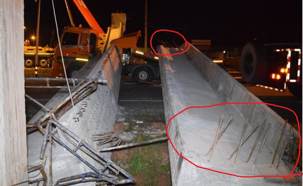 2. เนื่องจากมีเครนอยู่ใกล้ๆ กับสะพานลอย จึงต้องพิจารณาว่าเครนดังกล่าว อยู่ในขั้นตอนการยก หรือการเก็บเครน ซึ่งบูมเครนอาจไปชนกับคานคอนกรีตจนล้มก็ได้ทั้งนี้ ยังไม่ตัดปัจจัยว่า การล้มของคานคอนกรีตอาจเกิดขึ้นในขั้นตอนการยกคานคอนกรีตติดตั้ง ซึ่งต้องพิจารณาความสามารถของเครนที่นำมายก และการทำงานร่วมกันของเครนหลายตัว