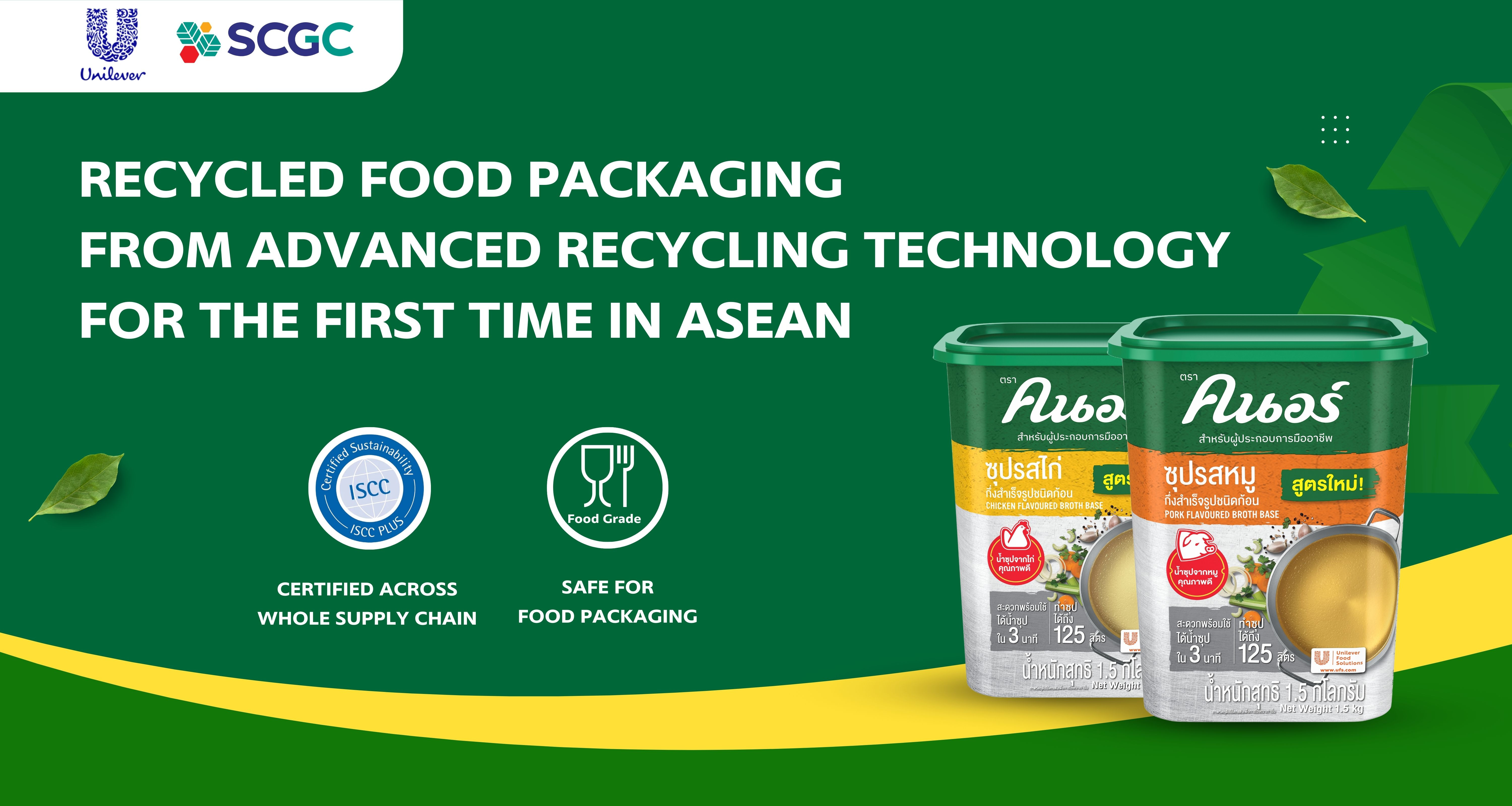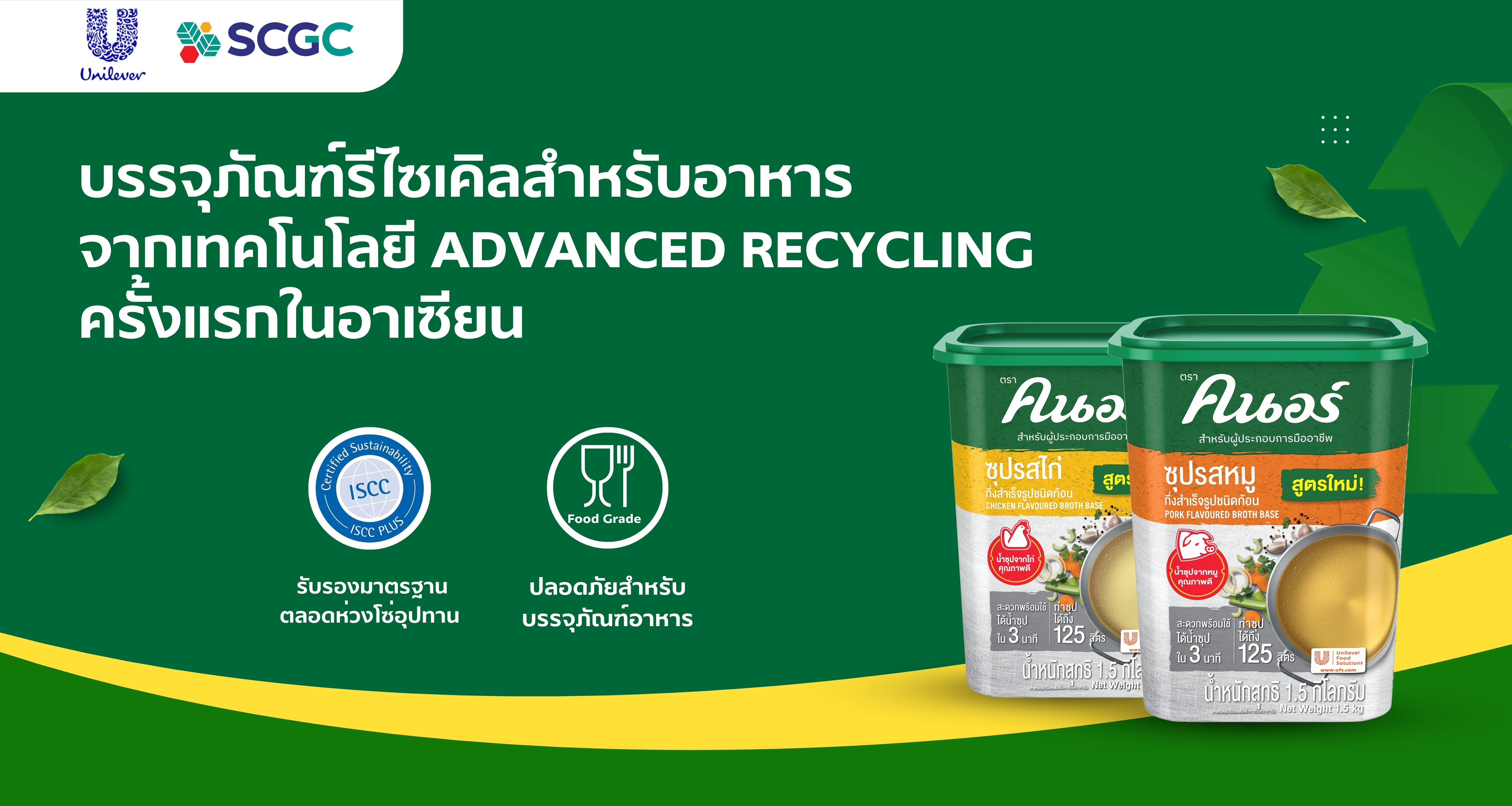 กลุ่มบริษัท ยูนิลีเวอร์ ประเทศไทย หรือ Unilever ผู้ผลิตสินค้าอุปโภคบริโภครายใหญ่ระดับโลก ร่วมกับ เอสซีจี เคมิคอลส์ หรือ SCGC ผู้นำธุรกิจพอลิเมอร์และโซลูชันครบวงจรเพื่อความยั่งยืน เปิดตัวบรรจุภัณฑ์รีไซเคิล แบรนด์ “คนอร์ สำหรับผู้ประกอบการมืออาชีพ” (Knorr Professional) ครั้งแรกในอาเซียน โดยพัฒนาบรรจุภัณฑ์รีไซเคิลชนิดฟู้ดเกรด (Food Grade) หรือ เกรดอาหารปลอดภัย ด้วยเทคโนโลยีรีไซเคิลขั้นสูง หรือ Advanced Recycling จาก SCGC GREEN POLYMERTM  สามารถเปลี่ยนพลาสติกใช้แล้วให้เป็นวัตถุดิบตั้งต้น (Circular Naphtha) โดยนำมาผลิตเป็นเม็ดพลาสติกใหม่ (Certified Circular Polyolefin Resin) ซึ่งมีคุณสมบัติเทียบเท่าเม็ดพลาสติกทั่วไป ผ่านการรับรองมาตรฐาน ISCC PLUS ครอบคลุมตลอดห่วงโซ่อุปทาน รายแรกของอุตสาหกรรมปิโตรเคมีในประเทศไทย จึงสามารถใช้ผลิตบรรจุภัณฑ์อาหารได้อย่างปลอดภัย ไม่มีสารเคมีหรือสารตกค้างที่อาจก่อให้เกิดอันตรายต่อร่างกาย หรือปนเปื้อนในอาหาร ถือเป็นบรรจุภัณฑ์อาหารจากกระบวนการรีไซเคิลขั้นสูงครั้งแรกในอาเซียน ซึ่งขณะนี้ ยูนิลีเวอร์ได้วางจำหน่ายผลิตภัณฑ์คนอร์ สำหรับผู้ประกอบการมืออาชีพ ที่ผลิตจากบรรจุภัณฑ์รักษ์โลกในประเทศไทยและเวียดนาม