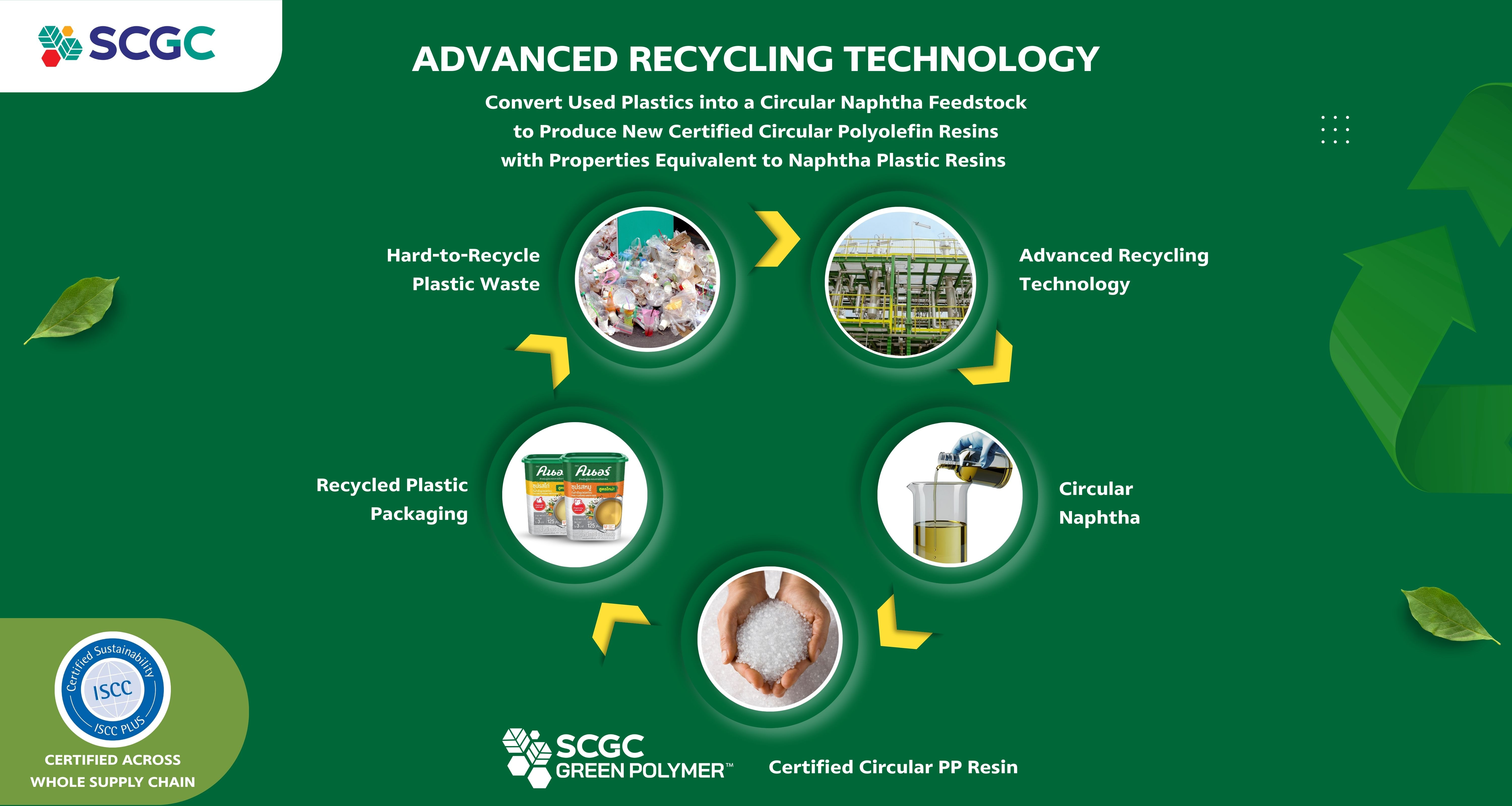 ด้านนายชาตรี เอี่ยมโสภณา ประธานเจ้าหน้าที่สายงานพาณิชย์ เอสซีจี เคมิคอลส์ (SCGC) กล่าวว่า “SCGC ให้ความสำคัญกับการพัฒนาเทคโนโลยีเพื่อตอบสนองความต้องการของลูกค้าในแต่ละอุตสาหกรรม โดยเฉพาะในภาคอุตสาหกรรมอาหารซึ่งมีข้อกำหนดด้านความปลอดภัยสูง ความร่วมมือกับยูนิลีเวอร์ในครั้งนี้นับเป็นก้าวสำคัญในการนำเทคโนโลยี Advanced Recycling ซึ่ง SCGC ได้พัฒนาขึ้นโดยใช้สารเร่งปฏิกิริยาทำให้กระบวนการรีไซเคิลมีอุณหภูมิต่ำ จึงช่วยลดการใช้พลังงาน เป็นมิตรต่อสิ่งแวดล้อม และช่วยลดปัญหาการสะสมของปริมาณขยะพลาสติกในประเทศ มาประยุกต์ใช้เชิงพาณิชย์กับบรรจุภัณฑ์อาหารเป็นครั้งแรกในอาเซียน ภายใต้การรับรองมาตรฐานสากลอย่าง ISCC PLUS ครอบคลุมตลอดห่วงโซ่อุปทาน แสดงให้เห็นถึงความก้าวหน้าทางเทคโนโลยีควบคู่กับการสร้างคุณค่าใหม่ให้กับขยะพลาสติกได้จริง โดยไม่กระทบต่อคุณภาพหรือความปลอดภัย โดย SCGC ถือเป็นรายแรกของอุตสาหกรรมปิโตรเคมีไทยที่ ISCC ให้การรับรองมาตรฐานฯ ตลอดทั้งห่วงโซ่อุปทาน (whole supply chain) ซึ่งบรรจุภัณฑ์ใหม่นี้จะช่วยลดปริมาณพลาสติกใช้แล้วถึง 30,000 กิโลกรัมต่อปี”