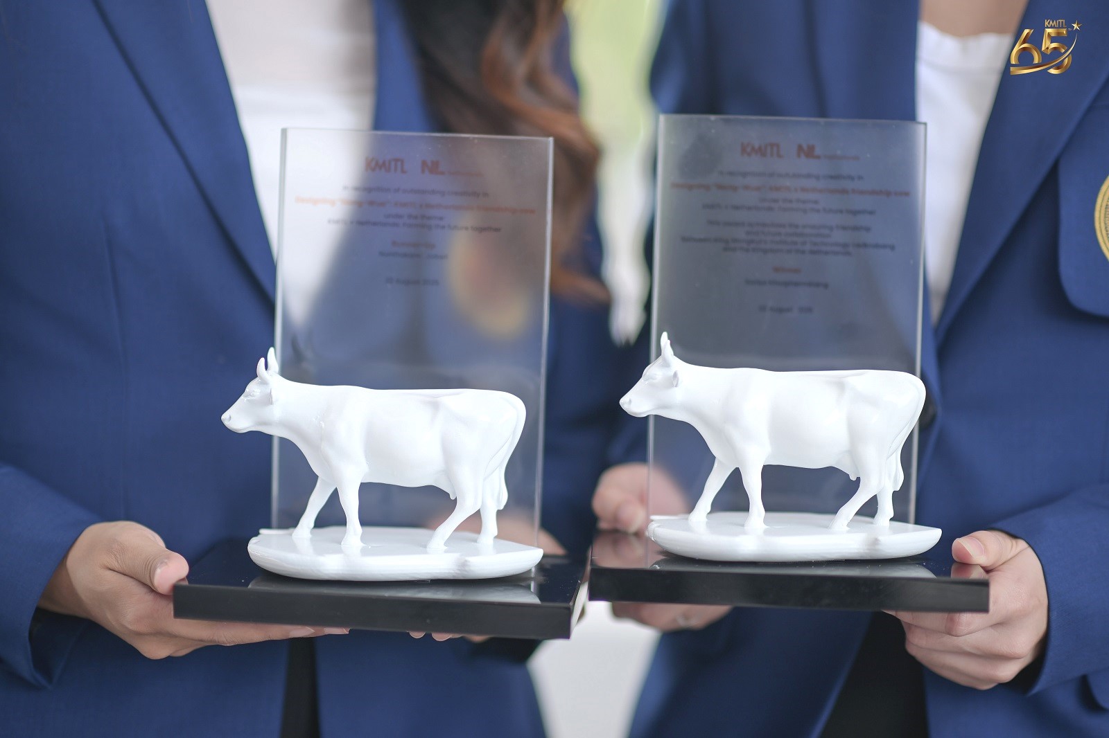 สถาบันเทคโนโลยีพระจอมเกล้าเจ้าคุณทหารลาดกระบัง (สจล.) ร่วมกับสถานเอกอัครราชทูตเนเธอร์แลนด์ประจำประเทศไทย จัดพิธีมอบ “น้องวัว” หรือ Friendship Cow ณ KMITL เพื่อเป็นสัญลักษณ์แห่งความร่วมมืออันแน่นแฟ้น ของทั้งสองประเทศ โดย “น้องวัว” ไม่ได้เป็นเพียงประติมากรรมเชิงศิลป์ แต่ยังสะท้อนถึงความไว้วางใจ มิตรภาพ และวิสัยทัศน์ร่วมกันในการสร้างอนาคตด้านเกษตรอัจฉริยะและความยั่งยืนพิธีดังกล่าวนับเป็นโอกาสพิเศษเนื่องในโอกาสครบรอบ 65 ปี และก้าวเข้าสู่ปีที่ 66 โดยมิตรภาพครั้งนี้จะเป็นเสมือนการสานต่อความร่วมมือระหว่างไทยและเนเธอร์แลนด์ในมิติด้านการศึกษา เกษตร และการวิจัยเพื่อสังคมโลก โดยจัดขึ้น ณ ลานนวัตกรรมดาราศาสตร์ อาคารหอพระราชประวัติพระบาทสมเด็จพระจอมเกล้าฯ สจล.“น้องวัว” เกิดจากโครงการประกวดออกแบบลวดลายภายใต้หัวข้อ “KMITL x Netherlands: Farming the Future Together” ซึ่งมีนักศึกษาส่งผลงานกว่า 46 ชิ้น และได้รับการคัดเลือก 2 ผลงานที่โดดเด่น ได้แก่1. “Blooming Tomorrow, together” รางวัลชนะเลิศ โดย นางสาวสริสา ขอเพิ่มกลาง นักศึกษาภาควิชาครุศาสตร์สถาปัตยกรรมและการออกแบบ คณะครุศาสตร์อุตสาหกรรมและเทคโนโลยี