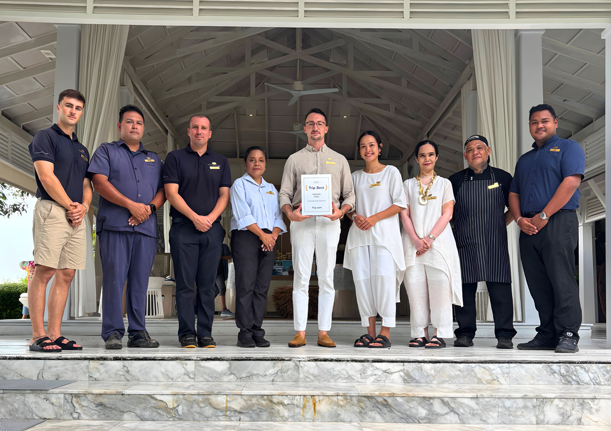 มร. อองตวน เดนดา (คนที่ 5 จากซ้าย) ผู้จัดการทั่วไปโรงแรมเคปกูดู เกาะยาวน้อย พร้อมด้วย ธนากร สุววัฒนะ (คนที่ 2 จากซ้าย) หัวหน้าแผนกวิศวกร, มร. โยฮัน ชอัช (คนที่ 3 จากซ้าย) หัวหน้าแผนกอาหารและเครื่องดื่ม, ศศิวิมล ไชยสมาน (คนที่ 4 จากซ้าย) หัวหน้าแผนกการเงิน, สาลินี สังสวัสดิ์ (คนที่ 6 จากซ้าย) หัวหน้าแผนกต้อนรับ, ปวเรศ กุลไพจิตร (คนที่ 8 จากซ้าย) หัวหน้าเชฟฝ่ายบริหาร และ พนักงานโรงแรม ร่วมแสดงความยินดี ที่โรงแรมฯ ได้รับรางวัล Trip.Best 2025 จาก Trip.com ณ โรงแรมเคปกูดู เกาะยาวน้อย โดยรางวัล Trip.Best 2025 เป็นการจัดอันดับผ่านการจองและได้รับคะแนนจากประสบการณ์จริงของผู้เข้าพักบน Trip.com หนึ่งในแพลตฟอร์มออนไลน์ด้านการท่องเที่ยวชั้นนำระดับโลก