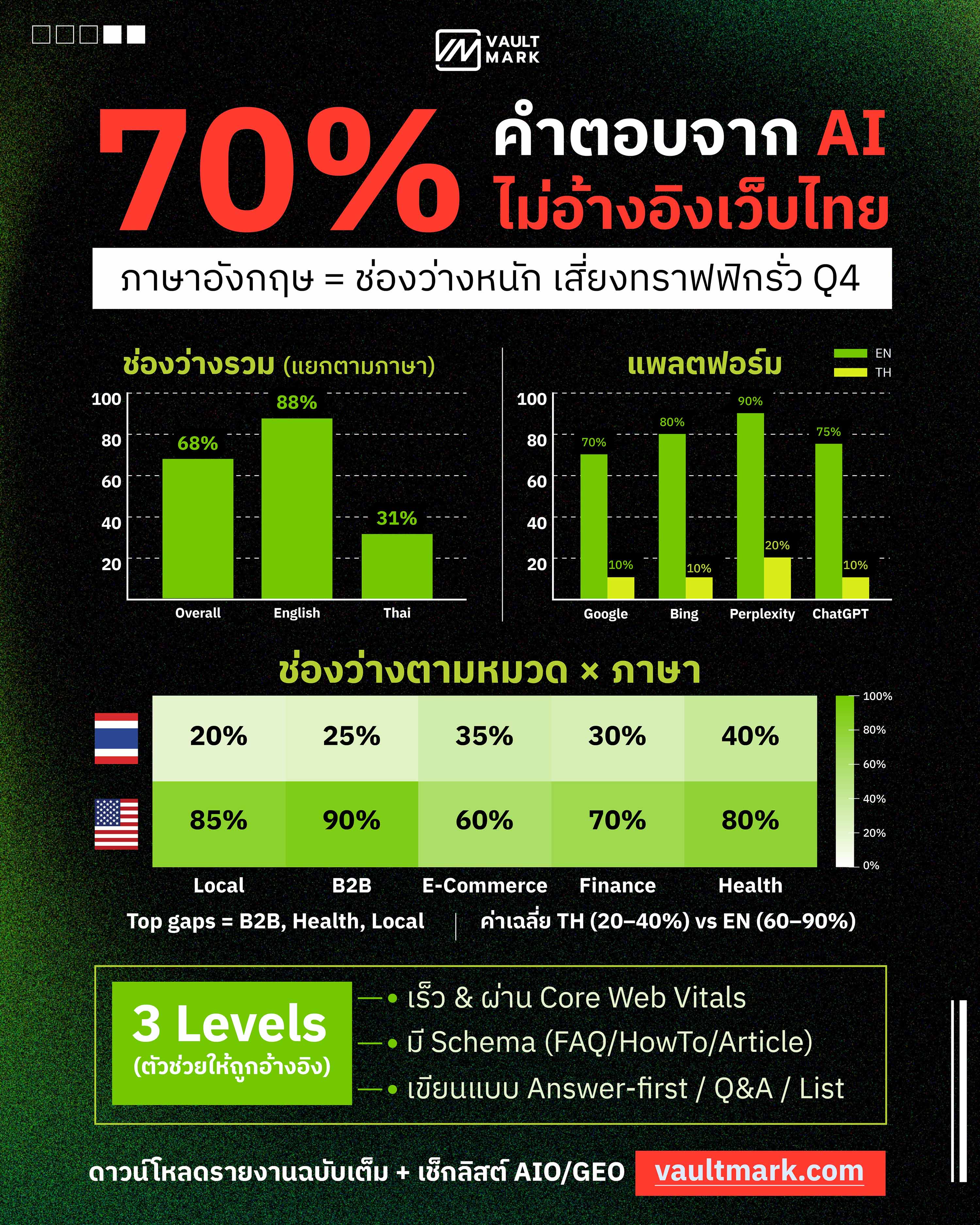 · ช่องว่างรวม: 70% ของคำตอบจาก AI ไม่มีการอ้างอิงโดเมนไทย
