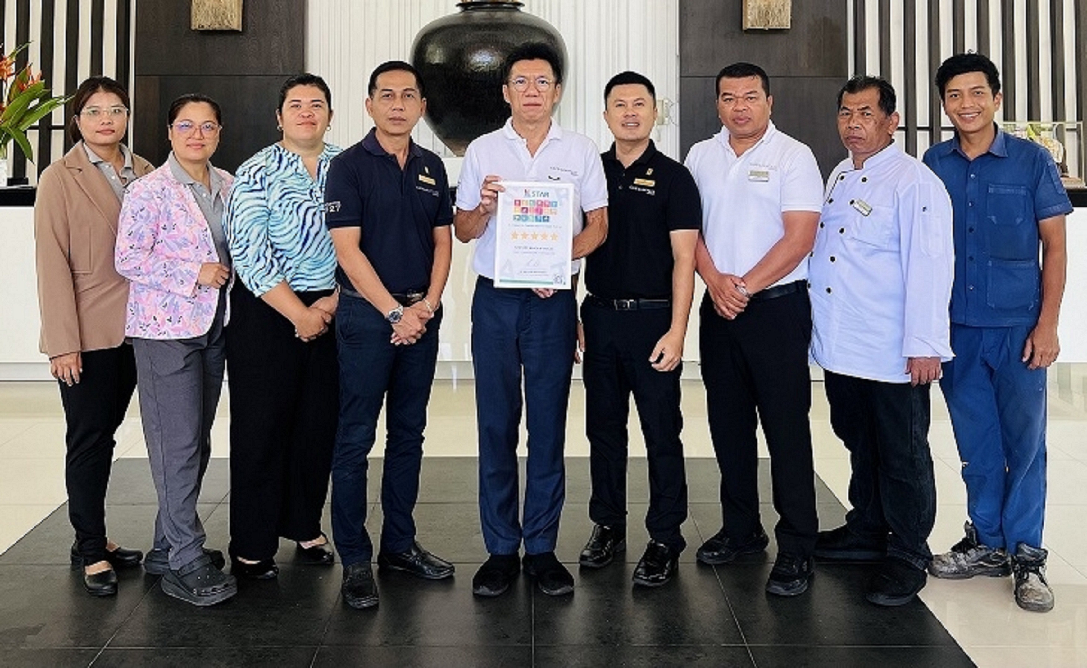 สมพงษ์ โสภณวงศากร (คนที่ 5 จากซ้าย) ผู้จัดการทั่วไปโรงแรมแคนทารี บีช เขาหลัก แสดงความยินดีที่โรงแรมแคนทารี บีช เขาหลัก ได้รับการรับรองจากการท่องเที่ยวแห่งประเทศไทยระดับ 5 ดาว ในการดำเนินธุรกิจตามเป้าหมายการท่องเที่ยวอย่างยั่งยืน (STGs: Sustainable Tourism Goals) โดยมี ธีรชัย แขมคำ (คนที่ 6 จากซ้าย) ผู้ช่วยผู้จัดการโรงแรมฯ, สุมาลี พ่วงพันธ์ (คนที่ 3 จากซ้าย) หัวหน้าฝ่ายแม่บ้าน, สุมิตร์ ศิริตัน (คนที่ 4 จากซ้าย) ผู้จัดการแผนกต้อนรับ, มานพ พิทักษ์ (คนที่ 7 จากซ้าย) ผู้จัดการแผนกอาหารและเครื่องดื่ม, ลักคณา บุหงารัตน์ (คนที่ 2 จากซ้าย) หัวหน้าฝ่ายการเงิน, จักรพงศ์ ปากลาว (คนที่ 9 จากซ้าย) หัวหน้าฝ่ายวิศวกรรม, สัญญา ครุฑสุวรรณ (คนที่ 8 จากซ้าย) รองหัวหน้าพ่อครัว และ พุทธิษา สาแรก (คนที่ 1 จากซ้าย) ร่วมกันแสดงความยินดี ณ โรงแรมแคนทารี บีช เขาหลัก