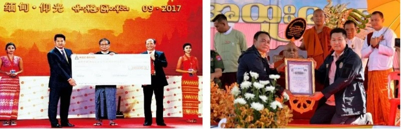 ภาพซ้าย: ปีพ.ศ. 2560 บริจาคเงินช่วยเหลือประชาชนในเขตภัยพิบัติประเทศเมียนมาร์เป็นจำนวน 20,000,000 จ๊าดเมียนมาร์