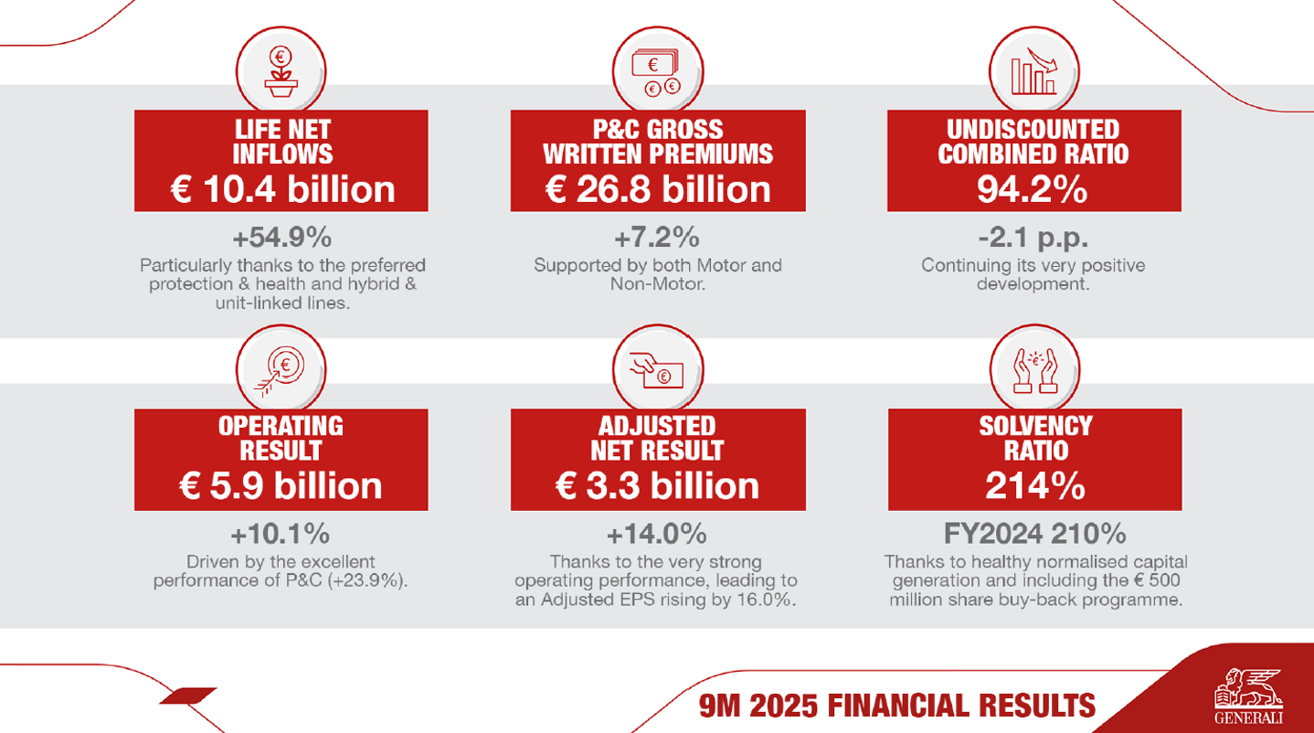 เจนเนอราลี่ กรุ๊ป เผยภาพรวมผลประกอบการ 9 เดือนแรกของปี 2025 เติบโตอย่างต่อเนื่องจากแรงสนับสนุนของทุกสายธุรกิจ ทำกำไรสุทธิหลังปรับปรุงรวมกว่า 3.3 พันล้านยูโร หรือกว่า 1.25 แสนล้านบาท เบี้ยประกันภัยรับรวม 2.79 ล้านล้านบาท ด้าน “ประกันชีวิต” มีกระแสเงินสดรับสุทธิกว่า 3.96 แสนล้านบาท ด้วยจุดเด่นเน้นสร้างผลิตภัณฑ์คุ้มครองและสุขภาพ มุ่งการออมแบบที่ใช้เงินทุนน้อย มีให้เลือกหลากหลาย ลดความเสี่ยง ตอบโจทย์เทรนด์ผู้บริโภคยุคใหม่ทั่วโลก มร.คริสเตียโน่ โบเรียน (Mr.Cristiano Borean) ประธานเจ้าหน้าที่ฝ่ายการเงิน เจนเนอราลี่ กรุ๊ป กล่าวว่า “ภาพรวมธุรกิจของเจนเนอราลี่ กรุ๊ป ในช่วง 9 เดือน ของปี 2025 ที่ผ่านมา มีการเติบโตอย่างต่อเนื่องจากแรงสนับสนุนของทุกสายธุรกิจที่ส่งผลต่อการเติบโตของผลการดำเนินงานในระดับสองหลัก ทั้งธุรกิจประกันชีวิตที่มีกระแสเงินสดรับต่อเนื่อง และธุรกิจประกันวินาศภัยที่มีการเติบโตของรายได้ที่แข็งแกร่ง และตอกย้ำความเป็นเลิศด้านเทคนิค รวมถึงอัตราส่วนรวมก่อนการคิดลดมูลค่าที่ปรับตัวดีขึ้น ด้วยการมุ่งดำเนินงานภายใต้แผนกลยุทธ์ Lifetime Partner 27: Driving Excellence เราจะเดินหน้าสร้างคุณค่าให้กับผู้มีส่วนได้ส่วนเสียทุกกลุ่ม โดยต่อยอดจากแรงส่งเชิงบวกนี้ ซึ่งสะท้อนผ่านกำไรต่อหุ้นที่เพิ่มขึ้น 16% เมื่อเทียบกับปีก่อน พร้อมด้วยงบดุลที่มั่นคง แหล่งสร้างกระแสเงินสดที่หลากหลาย และสถานะเงินทุนที่แข็งแกร่ง” ด้วยแผนกลยุทธ์ “Lifetime Partner 27: Driving Excellence” ซึ่งให้ความสำคัญกับความเป็นเลิศด้านความสัมพันธ์กับลูกค้า ความสามารถหลัก และรูปแบบการดำเนินงานของกลุ่ม บริษัทมุ่งเร่งการเติบโตของธุรกิจประกันชีวิตอย่างมีผลกำไร โดยอาศัยฐานลูกค้าที่กว้างขวางและเครือข่ายการจัดจำหน่ายที่แข็งแกร่ง นอกจากนี้ กลุ่มยังจะยกระดับความเชี่ยวชาญด้านเทคนิคเพื่อเพิ่มความสามารถในการทำกำไร และยกระดับประสิทธิภาพโดยการใช้ประโยชน์จากทรัพยากรของทั้งกลุ่มให้เกิดประสิทธิภาพสูงสุดในทุกช่วงของ value chain โดยยังคงให้ความสำคัญกับการทำให้ผลิตภัณฑ์ใช้งานง่ายและนวัตกรรม พร้อมนำเสนอผลิตภัณฑ์และโซลูชันที่ร่วมสมัย และบูรณาการ เพื่อรองรับความต้องการของลูกค้าที่เปลี่ยนแปลงในแต่ละช่วงชีวิต สำหรับธุรกิจประกันชีวิต มุ่งเน้นการคุ้มครองและสุขภาพ รวมถึงการออมแบบใช้เงินทุนน้อย เพื่อพัฒนาผลิตภัณฑ์ประกันที่ตอบโจทย์ความเสี่ยงและรูปแบบการลงทุนที่หลากหลาย เพื่อประโยชน์ทั้งต่อลูกค้าและกลุ่มบริษัท สำหรับผลิตภัณฑ์ด้านความคุ้มครองและสุขภาพ มุ่งให้บริการแบบครบวงจรตั้งแต่ต้นจนจบ 