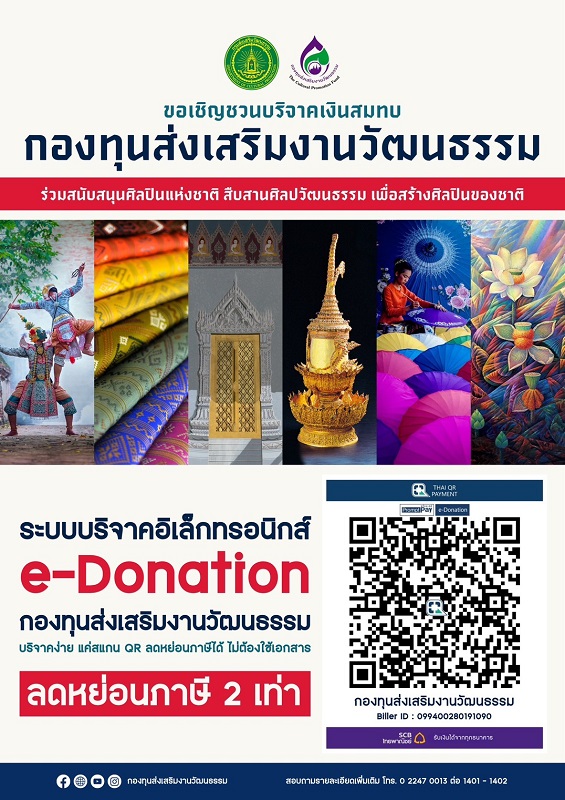 ท้ายที่สุดนี้ นางนวลพรรณ ล่ำซำ ประธานกรรมการกองทุนส่งเสริมงานวัฒนธรรม อยากจะขอเชิญชวนทุกท่าน ร่วมเป็นส่วนหนึ่งในการสนับสนุนการดำเนินงานด้านวัฒนธรรม สนับสนุนศิลปินแห่งชาติ สืบสานศิลปวัฒนธรรมของชาต โดยการบริจาคเงินสมทบผ่านกองทุนส่งเสริมงานวัฒนธรรม สามารถบริจาคง่าย ๆ ด้วยตนเอง เพียงสแกน QR Code โอนผ่านบัญชีธนาคารไทยพาณิชย์ สาขาถนนรัชดาภิเษก ชื่อบัญชี กองทุนส่งเสริมงานวัฒนธรรม เลขที่บัญชี 060-216511-7 หรือสามารถบริจาคด้วยตนเอง โดยเช็คสั่งจ่ายในนามกองทุนส่งเสริมงานวัฒนธรรม นอกจากท่านจะเป็นผู้ร่วมสืบสานศิลปวัฒนธรรมของชาติแล้ว ท่านยังสามารถลดหย่อนภาษีได้ 2 เท่า อีกด้วย