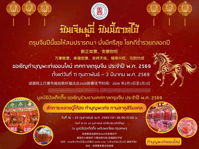 ระหว่างวันที่ 16 – 25 กุมภาพันธ์ พ.ศ. 2569 มูลนิธิป่อเต็กตึ๊ง โดย นายวิเชียร เตชะไพบูลย์ ประธานกรรมการ ขอเชิญศิษยานุศิษย์ และสาธุชนทุกท่าน ร่วม “สักการะหลวงปู่ไต้ฮง” ขอพรเนื่องในเทศกาลตรุษจีน ลงชื่อ สวดชัยมงคลคาถา หรือ “พะเก่ง” เพื่อความเป็นสิริมงคลตลอดปี เป็นพิธีมหามงคลใหญ่ 1 ปีมีเพียงครั้งเดียว ที่เปิดให้ทุกท่านได้เลือกทำบุญพะเก่งๆ ละ 20 บาทตามแต่ประสงค์ ประกอบด้วย ขอให้ครอบครัวมีสุข (แกหมึ่งเก่ง) , สะเดาะเคราะห์ (ปออุ่งเก่ง) , เสริมโชคลาภ (คิ่วไฉ่เก่ง) , เสริมดวงชะตา (ส่วยกุงเก่ง) , เสริมความมั่นคงสถาพร (กึงกีเก่ง) รวมถึงทำบุญสะเดาะเคราะห์และเสริมความเป็นสิริมงคลกับรูปปั้นนักษัตรปีมะเมีย  รับประทาน “สาคูสิริมงคล”  เพื่อความกลมเกลียวและอยู่เย็นเป็นสุข  อัญเชิญ “ฮู้แดง” (ยันต์) ของหลวงปู่ไต้ฮง เพื่อนำไปประทับหน้าบ้าน เคหะสถาน หรือพกติดตัวเพื่อคุ้มครอง  “เคาะระฆังทอง” ให้ก้องกังวานเพื่อให้ชีวิตสดใส การงานรุ่งเรืองระบือไกล และ ร่วม “พิธีเวียนธูปศักดิ์สิทธิ์” เพื่อขอพรเทพยดาฟ้าดินเนื่องในวันประสูติ (ทีกงแซ) ซึ่งในปีนี้ตรงกับวันอังคารที่ 24 กุมภาพันธ์ 2569 ขออำนาจฟ้าดินเป็นที่พึ่ง ขอให้สิ่งศักดิ์สิทธิ์ที่ตนนับถือ เช่น หลวงปู่ไต้ฮง ช่วยดลบันดาลให้ประสบโชคดีตลอดปีใหม่ (โดยในวันที่ 16 และ 24 กุมภาพันธ์ 2569 มูลนิธิป่อเต็กตึ๊ง เปิดบริการโต้รุ่ง)