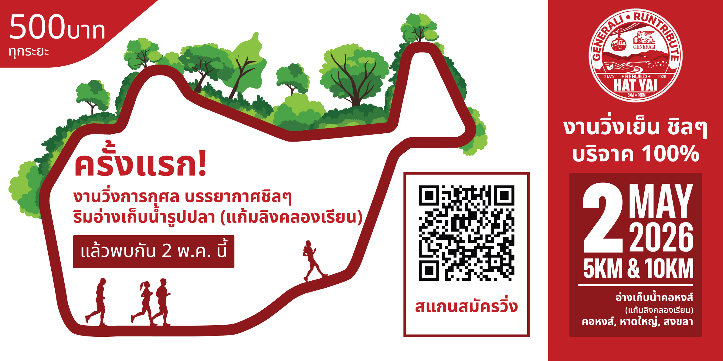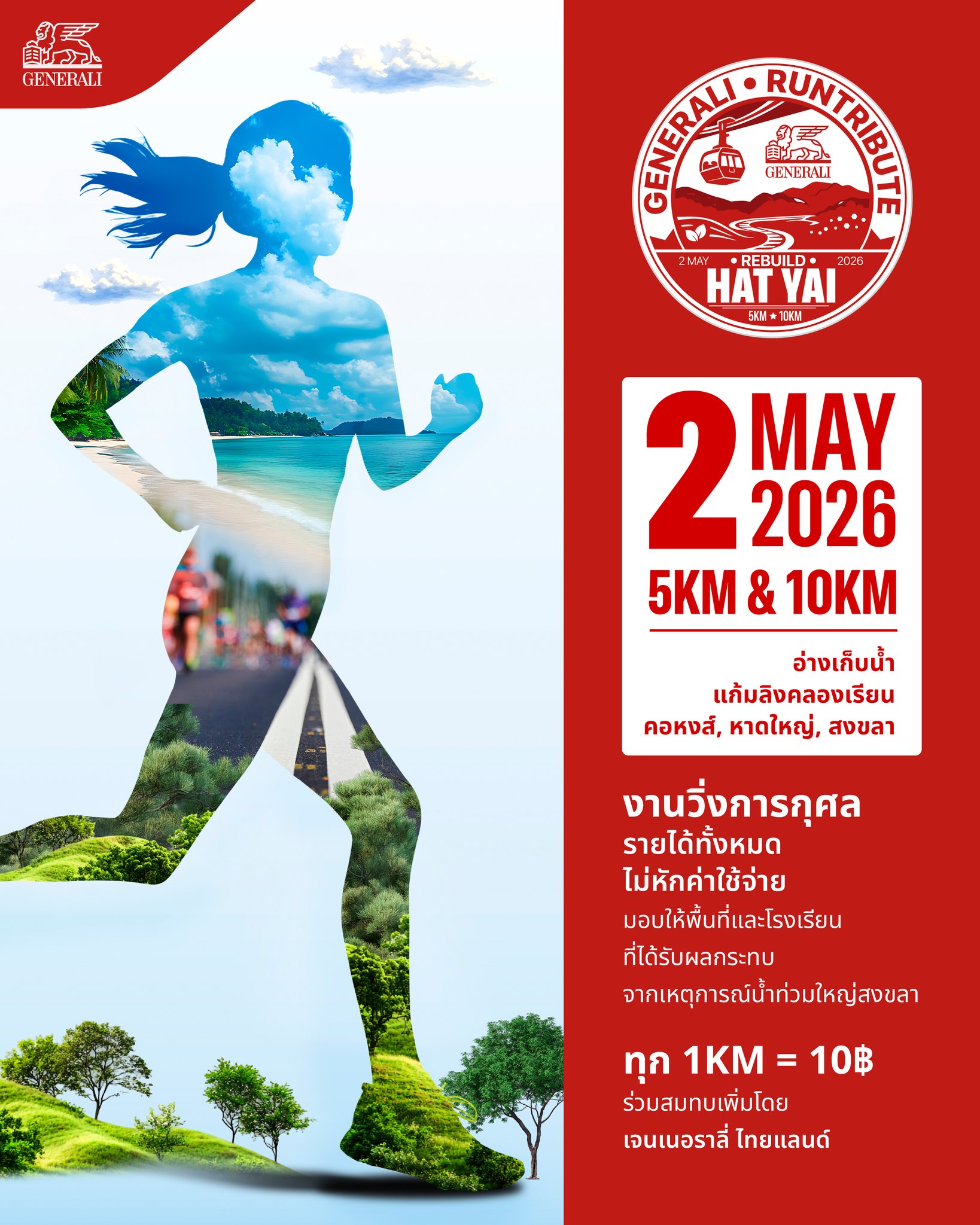 เจนเนอราลี่ ไทยแลนด์ ขอเชิญชวนประชาชนและผู้รักสุขภาพ ร่วมเป็นส่วนหนึ่งของพลังแห่งการให้ในกิจกรรม “GENERALI RUNTRIBUTE: REBUILD HAT YAI” งานวิ่งการกุศลที่จัดขึ้นเพื่อรวมพลังของนักวิ่งและคนไทยทุกคน สร้างพลังเล็ก ๆ ที่ยิ่งใหญ่ เพราะทุกก้าวของคุณคือความห่วงใย และทุกการเข้าเส้นชัย คือพลังฟื้นฟูชุมชนและส่งต่อความห่วงใยไปยังพื้นที่ที่ได้รับผลกระทบจากเหตุการณ์น้ำท่วมใหญ่ จังหวัดสงขลาสำหรับกิจกรรม “GENERALI RUNTRIBUTE: REBUILD HAT YAI” จัดขึ้นในวันที่ 2 พฤษภาคม 2569 ตั้งแต่เวลา 14.00 - 20.00 น. ณ อ่างเก็บน้ำคอหงส์ (แก้มลิงคลองเรียน) เทศบาลเมืองคอหงส์ อำเภอหาดใหญ่ จังหวัดสงขลา โดยแบ่งรูปแบบการวิ่งออกเป็น Mini Marathon ระยะทาง 10 กิโลเมตร และ Fun Run ระยะทาง 5 กิโลเมตร ค่าสมัครเพียง 500 บาท ทุกระยะทาง พร้อมร่วมวิ่งไปกับ “วีเจจ๋า” ณัฐฐาวีรนุช ทองมี ที่จะมาร่วมสร้างสีสันและแรงบันดาลใจตลอดเส้นทางรายได้จากค่าสมัครทั้งหมดโดยไม่หักค่าใช้จ่าย จะถูกนำไปมอบให้แก่ 6 โรงเรียนในจังหวัดสงขลาที่ได้รับผลกระทบจากอุทกภัย และอยู่ระหว่างการฟื้นฟู ได้แก่ โรงเรียนบ้านวังหรัง (ประสิทธิ์อุปถัมภ์), โรงเรียนคลองแดนวิทยา, โรงเรียนบ้านปากบาง, โรงเรียนบ้านห้วยสมบูรณ์, โรงเรียนชะแล้นิมิตวิทยา และโรงเรียนวัดป่าขวาง (ธรรมรักษ์ราษฎร์ศึกษา)นอกจากนี้ เจนเนอราลี่ ไทยแลนด์ ยังได้ร่วมสมทบเงินสนับสนุนจากการวิ่ง ทุก ๆ 1 กิโลเมตร เปลี่ยนเป็นเงิน 10 บาท เพื่อร่วมเป็นส่วนหนึ่งในการขับเคลื่อนการฟื้นฟูชุมชนและเศรษฐกิจท้องถิ่นของหาดใหญ่ให้กลับมามีชีวิตชีวาอีกครั้งพร้อมมอบสิทธิพิเศษ “ประกันภัยอุบัติเหตุกลุ่ม เจนเนอราลี่”* สำหรับนักวิ่งกลุ่ม Early Bird ที่สมัครเข้าร่วมกิจกรรมภายในวันที่ 20 เมษายน 2569 เท่านั้น เพื่อเสริมความมั่นใจตลอดการแข่งขัน ด้วยความคุ้มครองกรณีเสียชีวิตจากอุบัติเหตุ หรือทุพพลภาพถาวร วงเงิน 50,000 บาทต่อคน และค่ารักษาพยาบาลจากอุบัติเหตุ วงเงิน 5,000 บาทต่อคนสำหรับผู้สนใจสามารถสมัครเข้าร่วมกิจกรรมได้ที่ https://www.runlah.com/th/grhy26 ตามรายละเอียดเพิ่มเติมได้ทาง Facebook: Generali Thailand