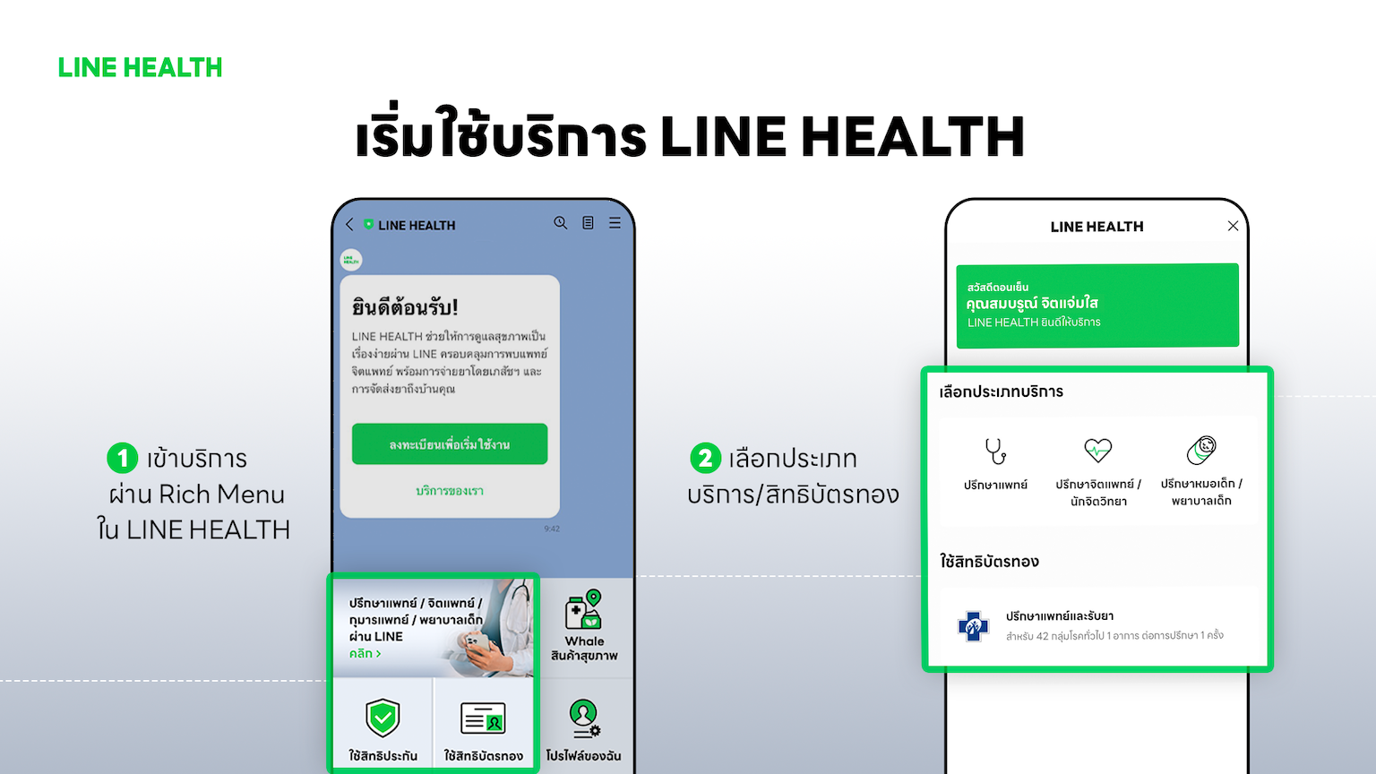 เริ่มต้นใช้งาน LINE HEALTH ทำได้ง่ายเพียง 3 ขั้นตอน เริ่มจาก เพิ่มเพื่อน @LINEHEALTH ลงทะเบียนด้วยข้อมูลพื้นฐานและยืนยันตัวตนด้วยรหัส OTP เพียงครั้งเดียว แล้วเลือกเมนูบริการที่ต้องการผ่าน Rich Menu ก็สามารถเริ่มปรึกษาแพทย์ได้ทันที ขั้นตอนทั้งหมดใช้เวลาเพียงไม่กี่นาที เหมาะกับไลฟ์สไตล์คนยุคใหม่ที่ต้องการความสะดวกและรวดเร็ว