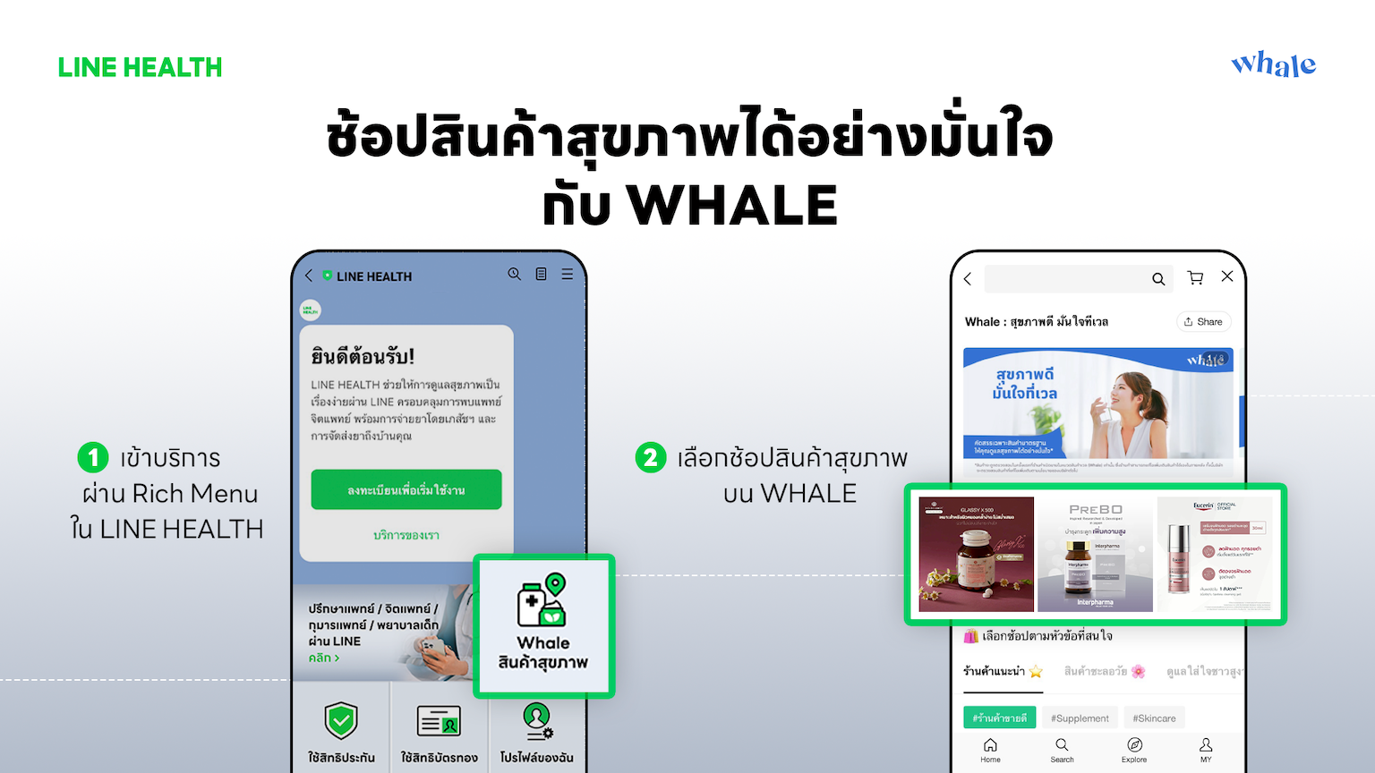นอกจากนี้ ยังสามารถเลือกซื้อสินค้าคุณภาพในกลุ่มวิตามินและอาหารเสริม รวมถึงผลิตภัณฑ์เสริมและบำรุงความงามได้อย่างมั่นใจ จากการคัดสรรค์ภายใต้มาตรฐานของ LINE ได้ที่ WHALE ได้อีกด้วย