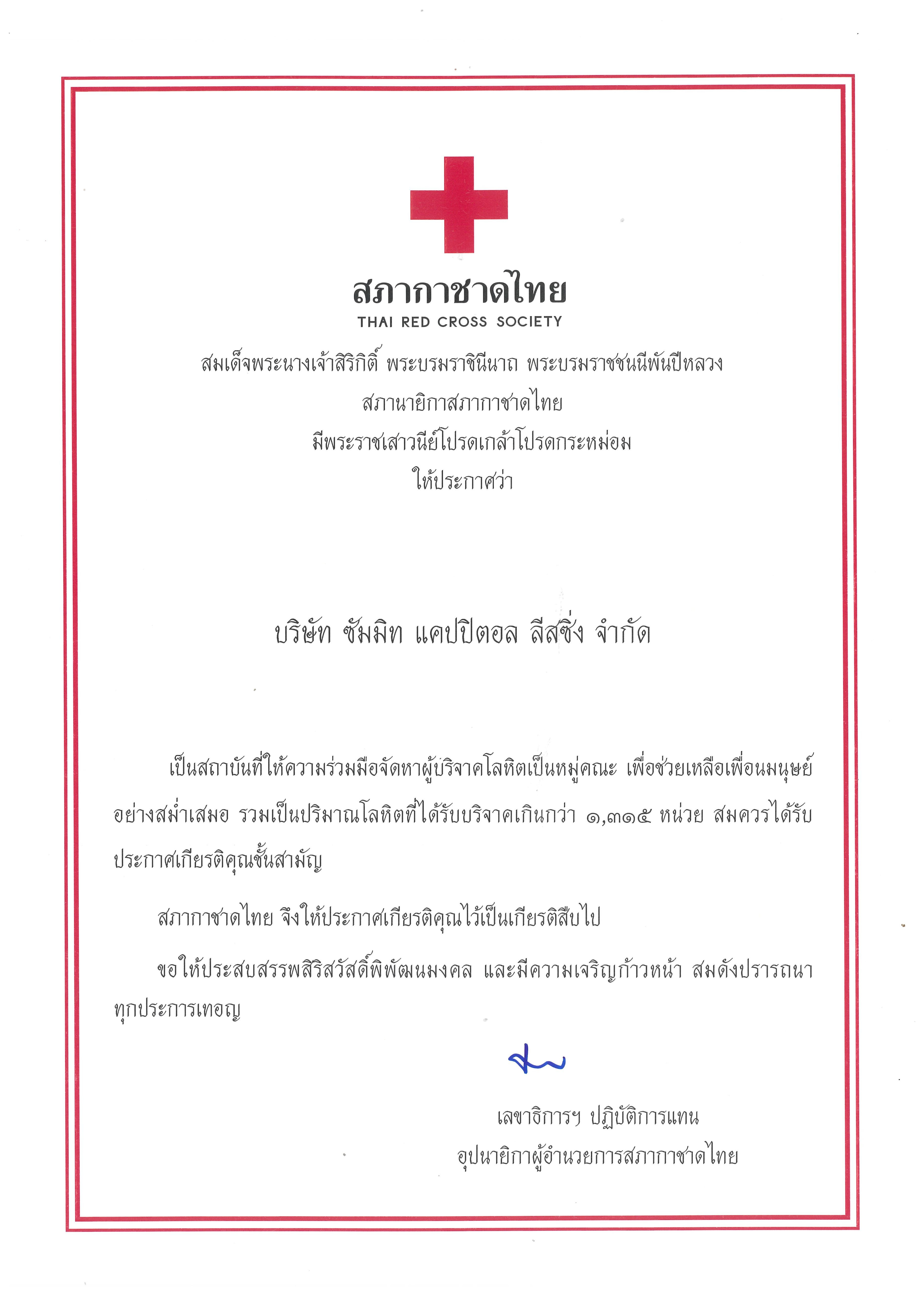 news & activity / ซัมมิท แคปปิตอล รับใบประกาศเกียรติคุณ จากสภากาชาดไทย หน่วยงานทีสนับสนุนการบริจาค