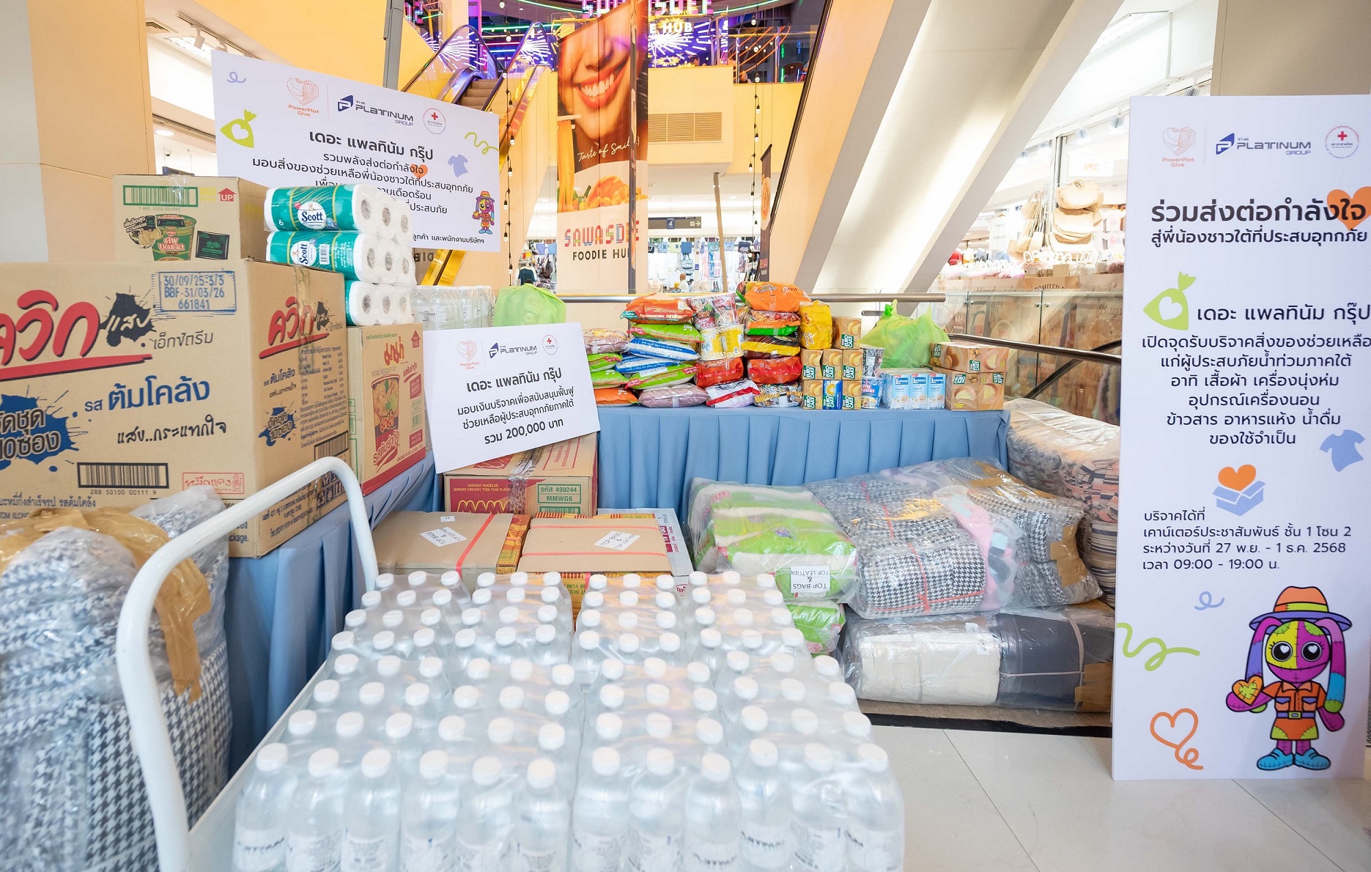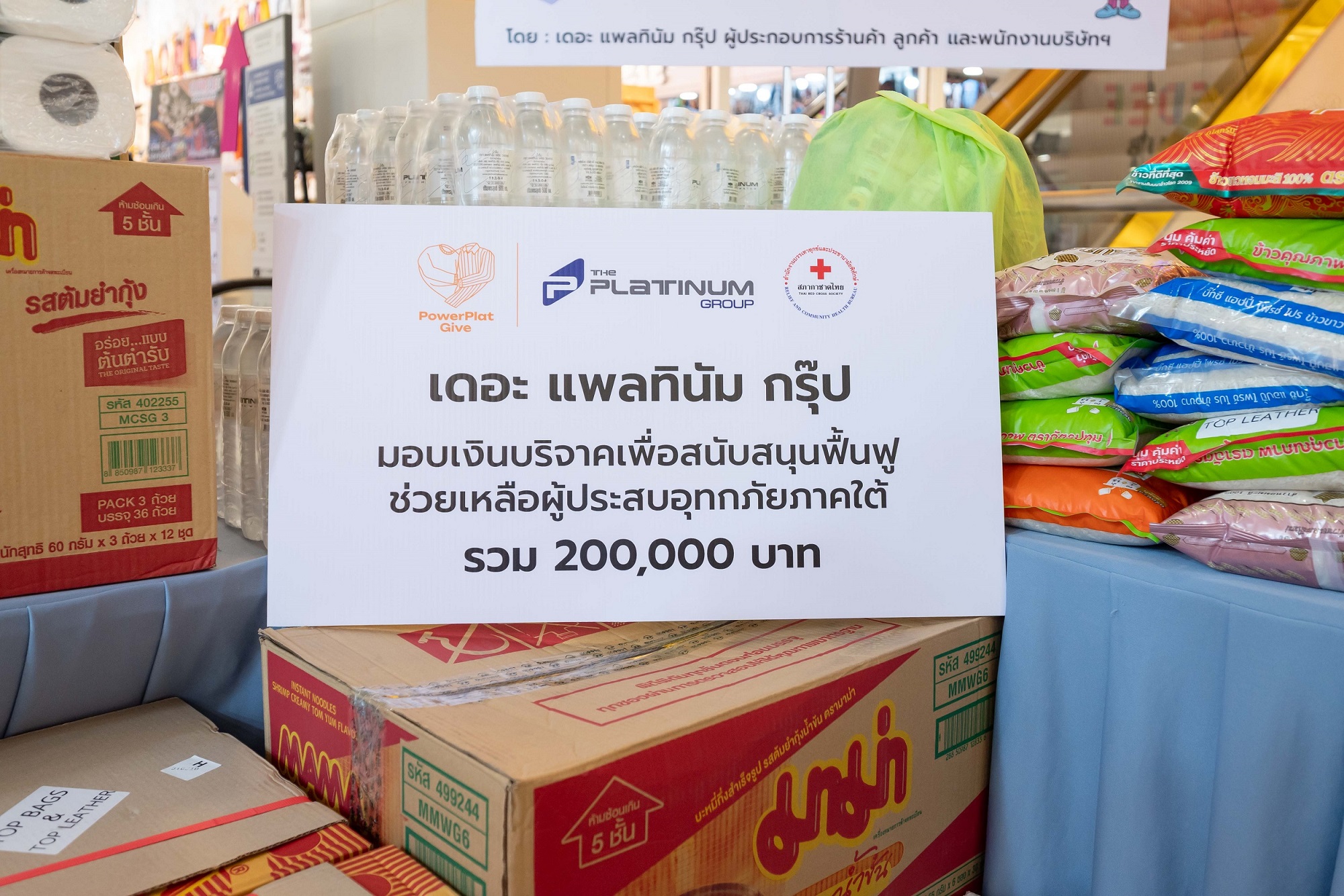 บริษัท เดอะ แพลทินัม กรุ๊ป จำกัด (มหาชน) มอบเงินและสิ่งของจำเป็น เพื่อบรรเทาความเดือดร้อนฟื้นฟูผู้ประสบอุทกภัยภาคใต้ โดยนายสาธิต เติมประยูร ผู้ช่วยกรรมการผู้จัดการใหญ่ บริษัท เดอะ แพลทินัม กรุ๊ป จำกัด (มหาชน) เป็นตัวแทนบริษัท ในการ มอบเงินบริจาค จำนวน 200,000 บาท พร้อมรวบรวมสิ่งของอุปโภคบริโภคจำเป็น จากผู้ประกอบการร้านค้า ลูกค้า และพนักงานบริษัทฯ  ส่งมอบให้แก่ พลโท นายแพทย์อำนาจ บาลี ผู้อำนวยการสำนักงานบรรเทาทุกข์และประชานามัยพิทักษ์ สภากาชาดไทย เพื่อนำไปช่วยเหลือบรรเทาฟื้นฟูผู้ประสบอุทกภัยภาคใต้ ณ สำนักบรรเทาทุกข์และประชานามัยพิทักษ์ สภากาชาดไทย เมื่อเร็วๆนี้