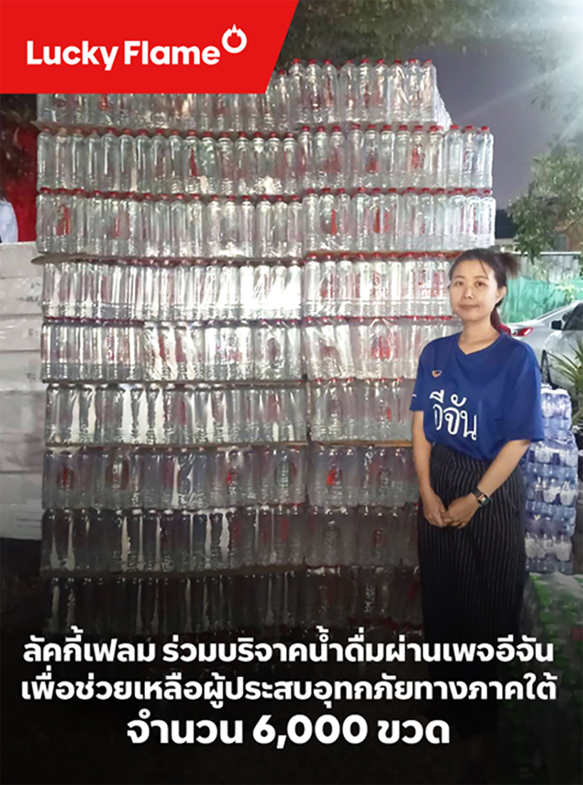 จากสถานการณ์ภัยพิบัติที่ส่งผลกระทบต่อพี่น้องประชาชนในอำเภอหาดใหญ่ จังหวัดสงขลา รวมถึงผู้อพยพในพื้นที่ชายแดน บริษัทฯ จึงผนึกกำลังกับพันธมิตรจากหลายภาคส่วน ร่วมดำเนินภารกิจ “ลัคกี้เฟลมรวมใจ ช่วยภัยหาดใหญ่” เพื่อส่งต่อ “ลัค” ในรูปแบบของความช่วยเหลือเร่งด่วน การฟื้นฟูอาชีพ และการดูแลคุณภาพชีวิต รวมมูลค่ากว่า 1 ล้านบาท ครอบคลุมทั้งการบรรเทาทุกข์ระยะเร่งด่วน และการสร้างโอกาสให้ชุมชนสามารถลุกขึ้นยืนได้อีกครั้งในระยะยาว ส่งต่อ ‘ลัค’ ผ่าน 4 กิจกรรมหลัก