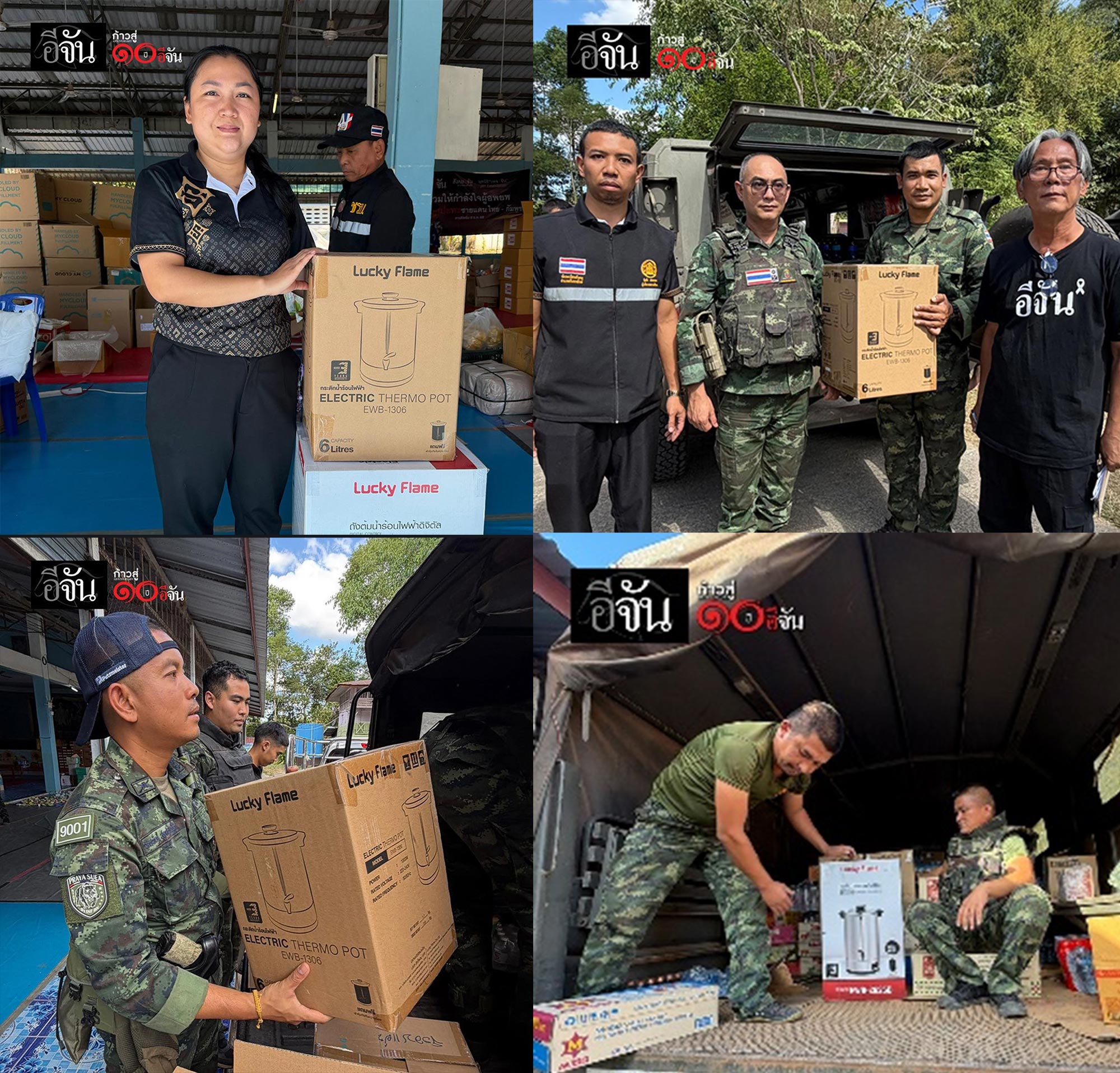 กิจกรรมที่ 4  ส่งต่อความอบอุ่น ดูแลคุณภาพชีวิตในศูนย์อพยพ อีกหนึ่งการส่งต่อ “ลัค” ที่สำคัญ คือการดูแลชีวิตประจำวันของผู้อพยพ ลัคกี้เฟลม มอบถังต้มน้ำร้อนจำนวน 120 ชุด ผ่าน อีจัน เพื่อสนับสนุนศูนย์อพยพในพื้นที่ชายแดนไทย–กัมพูชา และศูนย์พักพิงในอำเภอหาดใหญ่ เติมความอบอุ่นและความปลอดภัยในช่วงเวลาที่ยากลำบาก