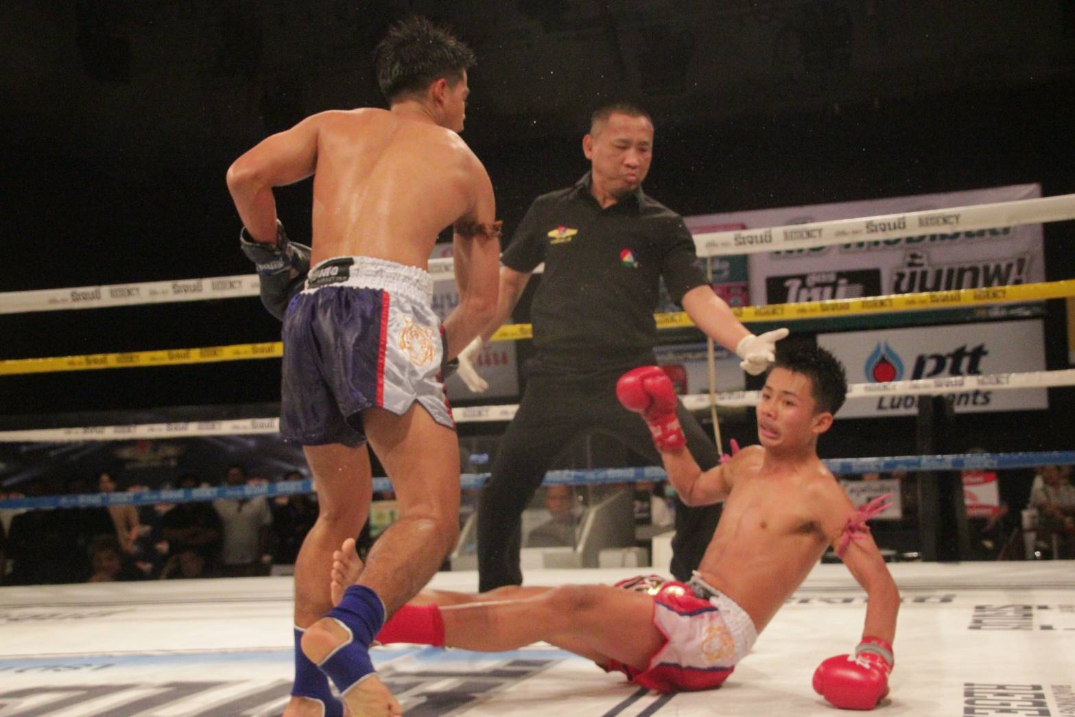 คู่ที่ 1. น็อกยก3 ซุปเปอร์บอล ต.พิทักษ์ชัย (แดง) พบกับ ยอดกัณฆ์ ช้างนครศรี (น้ำเงิน) ทั้งคู่เป็นมวยเข่าในอาชีพมวยขวาด้วยกัน ยอดกัณฆ์ เป็นฝ่ายเดินเข้าหาเตะขวาลำตัวด้าน ซุปเปอร์บอล คอยโต้จังหวะสองเตะขวาได้เน้นๆ ทั้งคู่ปักหลักแรกกันกลางเวที ยอดกัณฆ์ พยามเร่งเกมส์เตะขวาต่อยหมัดช่วงต้นยก3 "ยอดกัณฆ์" ได้จังหวะที่ "ซุปเปอร์บอล" ขวา ฮุคขวาเต็มๆเข้าปลายคาง "ซุปเปอร์บอล" ร่วงทั้งยืนกรรมการนับ 8 ชกต่อได้ "ยอดกัณฆ์" ไม่รีรอวิ่งเข้าหาอุคขวาเต็มๆเข้าปลายคางอีกรอบร่วงให้กรรมการนับ 10 ทำให้ "ยอดกัณฆ์" เป็นฝ่ายชนะทีเคโอยก3