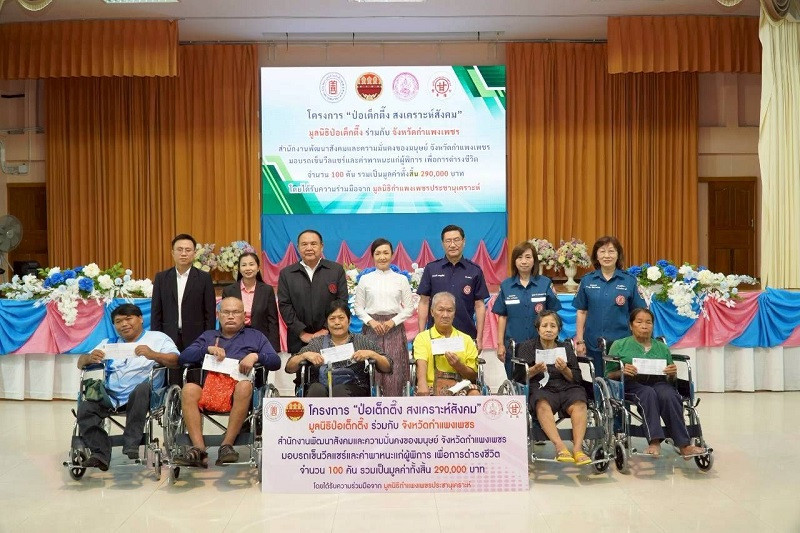 สำหรับโครงการ “ป่อเต็กตึ๊ง สงเคราะห์สังคม” โดยการมอบเข็นวีลแชร์แก่ผู้พิการ มูลนิธิฯ ได้ดำเนินการมาเป็นระยะเวลานับ 10 ปี ซึ่งในปี พ.ศ. 2568 นี้ มูลนิธิฯ กำหนดดำเนินการมอบเข็นวีลแชร์พร้อมค่าพาหนะแก่ผู้พิการ รวม 5 จังหวัด ประกอบด้วย จังหวัดบุรีรัมย์ ชัยภูมิ หนองบัวลำภู แพร่ และกำแพงเพชร คิดเป็นมูลค่าทั้งสิ้น 1,450,000 บาท (หนึ่งล้านสี่แสนห้าหมื่นบาทถ้วน)